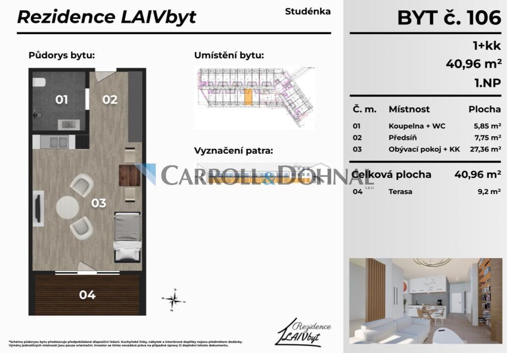 Byt č. 106 se nachází v 1. NP, má dispozici 1+kk a užitnou plochu 40,9 m. K bytu náleží terasa o velikosti 9,2 m a předzahrádka 15 m, což zajišťuje příjemné venkovní zázemí.
