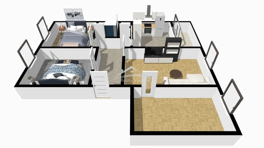 Dispozice bytu je velmi dobře řešená, pouze jeden pokoj je průchozí - viz 3D plány bytu na posledních fotografiích. V koupelně je vana i sprchový kout, toaleta je samostatná. Kolem domu je dostatek parkovacích míst a příjemné prostředí s výhledem do přírody.