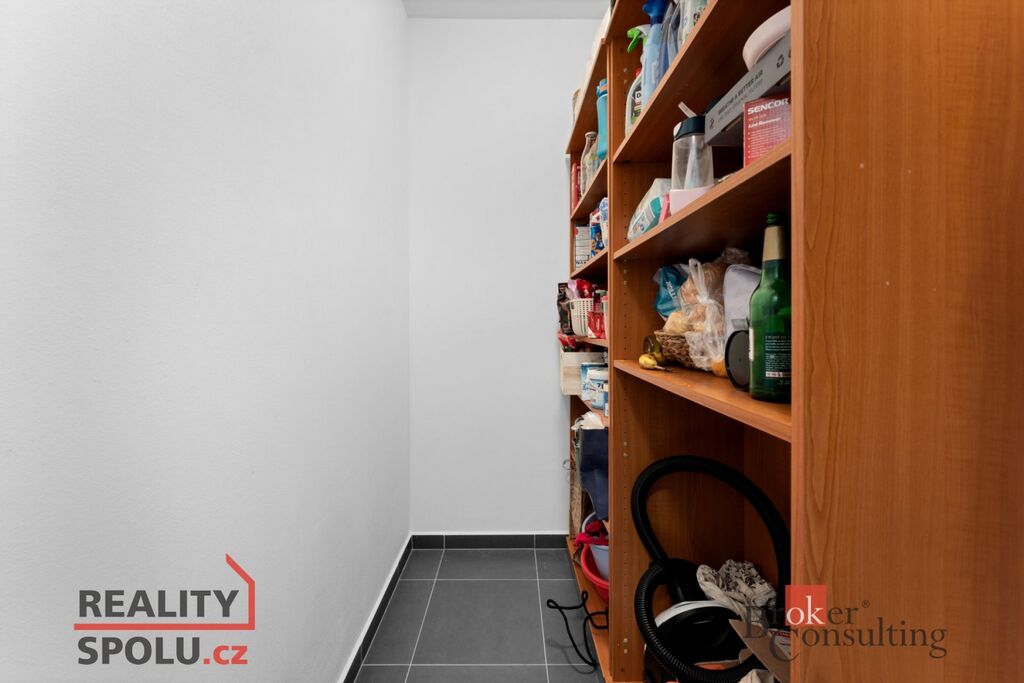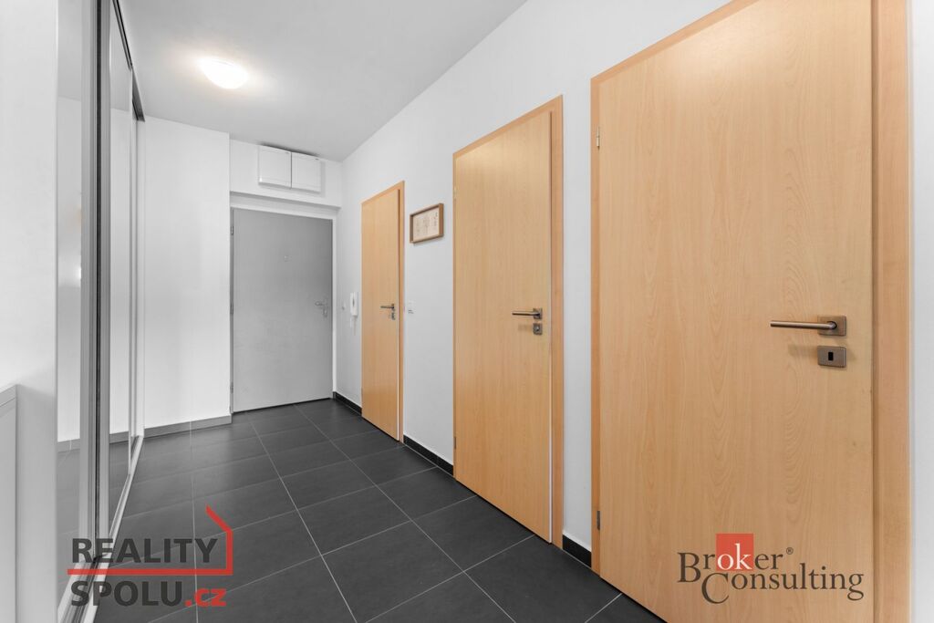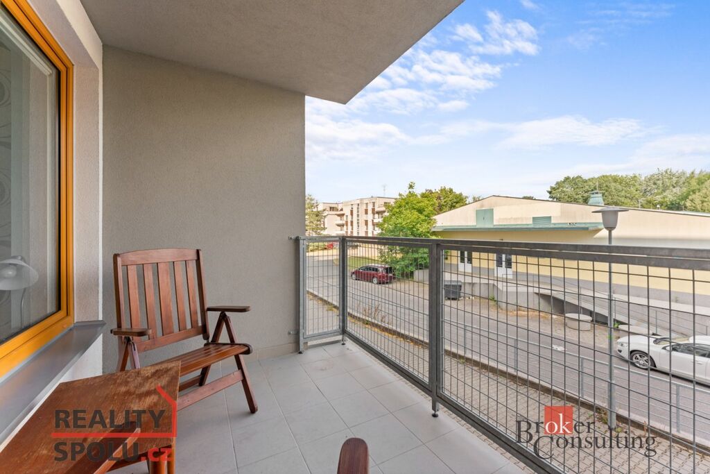 Byt se pronajímá částečně vybaven: kuchyňská linka s vestavěnými spotřebiči včetně myčky, jídelní stůl spojený s kuchyňskou linkou a jídelní židle, vestavěné skříně, koberec a sezení na balkoně. K bytu dále náleží komora v bytě, lodžie se vstupem z obývacího pokoje, sklep a společná kolárna.