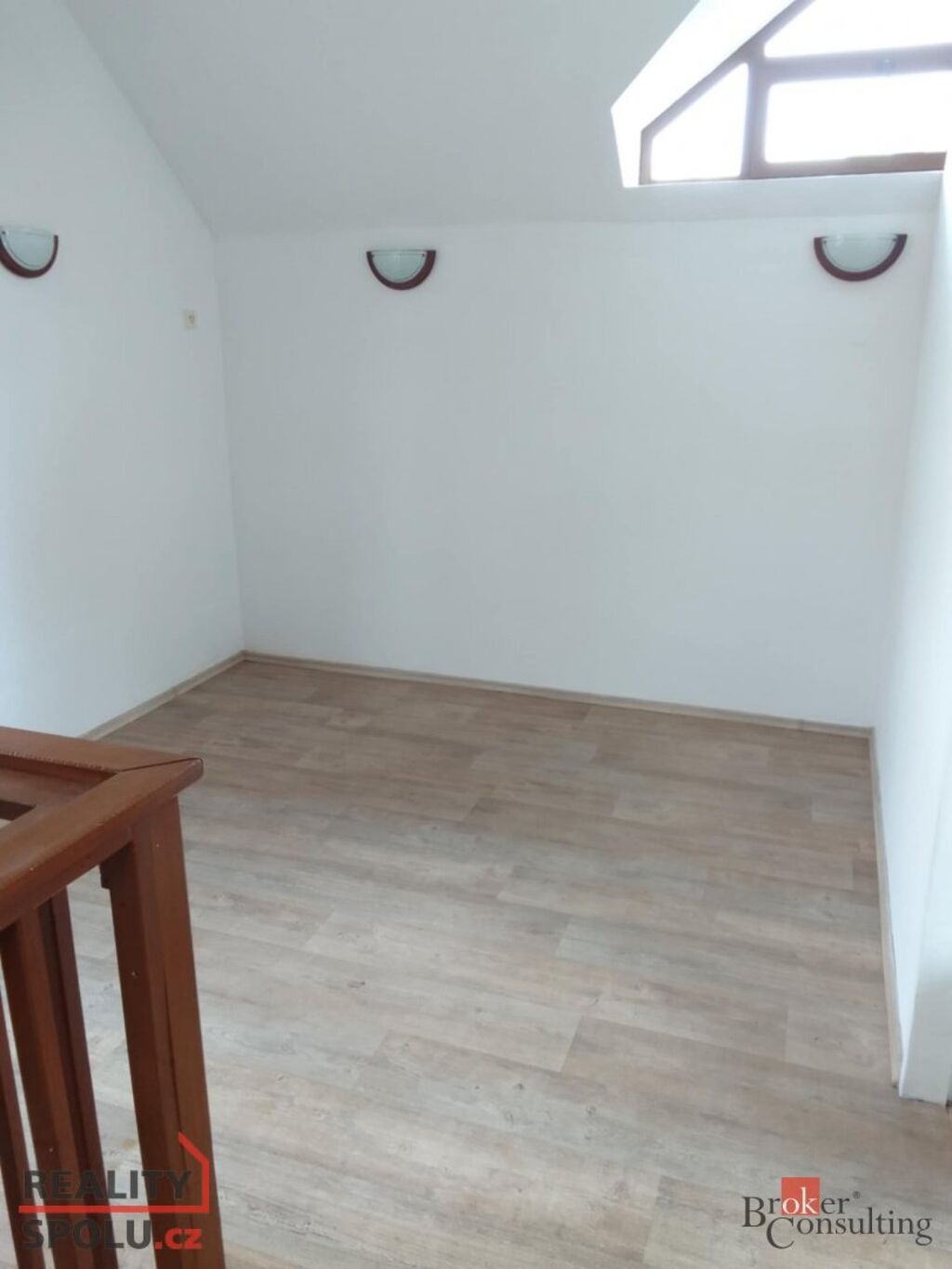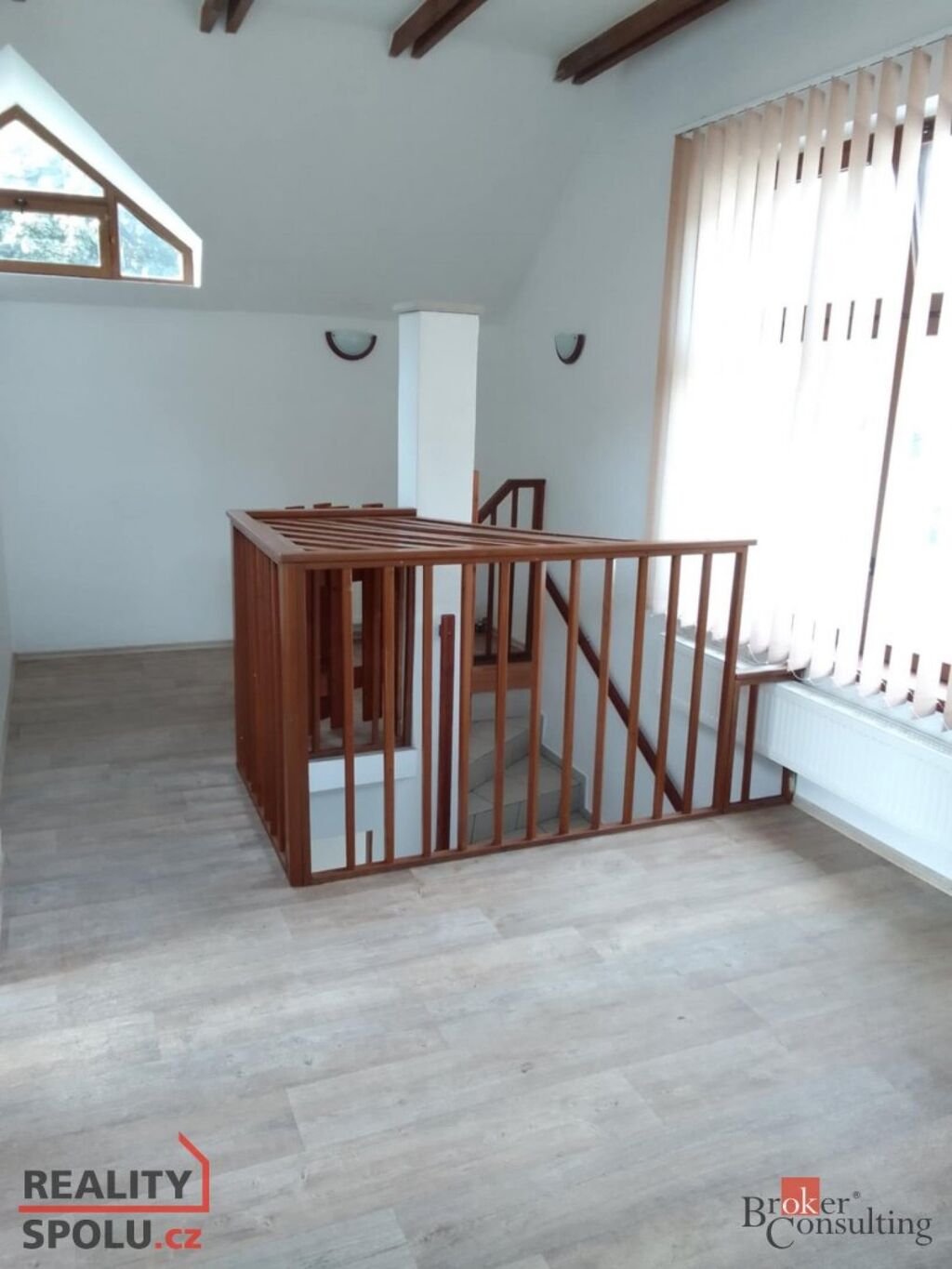 V patře je světlá kuchyně propojená s obývacím pokojem.
