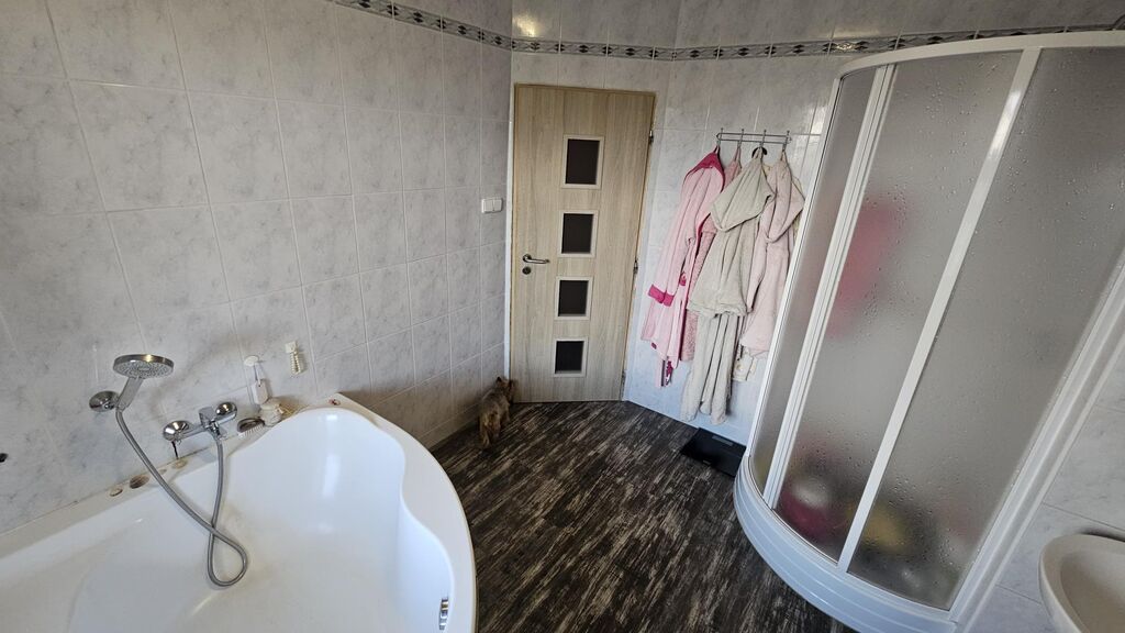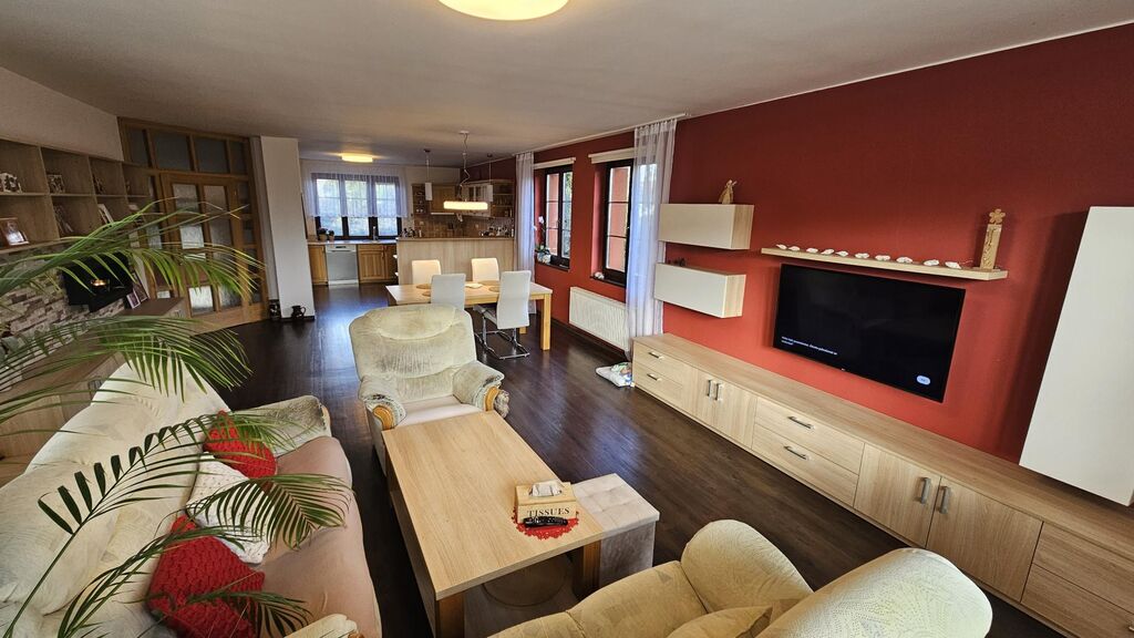 Prodej velmi pěkného - moderního rodinného domu o velikosti 5 + 1 + 2 x koupelna a WC s terasou, bazénem a zahradou na okraji městečka Rožmitál pod Třemšínem, ulice Sladkovského 761. Dům je moderně stavěný a je z roku 2020. Rožmitál p. Tř. je napojený na pražskou autobusovou integrovanou dopravu - pid. Dobré autobusové spojení na Prahu -a Příbram, dále Plzeň. U Rožmitálu začínají husté Brdské lesy. V Rožmitále p. Tř. je veškerá občanská vybavenost - obchody, škola, školka, lékař a další. Popis domu : suterén - částečně podsklepeno - kotelna a uhelna / moderní kotel ústředního topení na pevná paliva se zásobníkem /, úložné prostory a místnost pod garáží - montážní jáma. Přízemí - vstupní chodba a zádveří, velká hlavní obytná místnost s napojením na kuchyň a jídelnu a vstupem na terasu, 2 samostatné ložnice / jedna je se vstupem na terasu /, koupelna a WC, vstup do garáže - parkování na 1 auto - úložné prostory, vstup do suterénu. Podkroví - 2 samostatné velké pokoje / zatím je dodělán 1 pokoj /, koupelna a WC. Za domem je velká terasa s menším zapuštěným bazénem. Pěkná udržovaná zahrada. Celý pozemek je oplocen. Vybavenost : elektřina 220/380V, obecní vodovod a kanalizace, ústřední topení - radiátory a kotel na pevná paliva se zásobníkem. Plánky domu jsou ve fotkách. Dobré a klidné bydlení. Podrobné informace v RK. Prohlídky domu po domluvě.