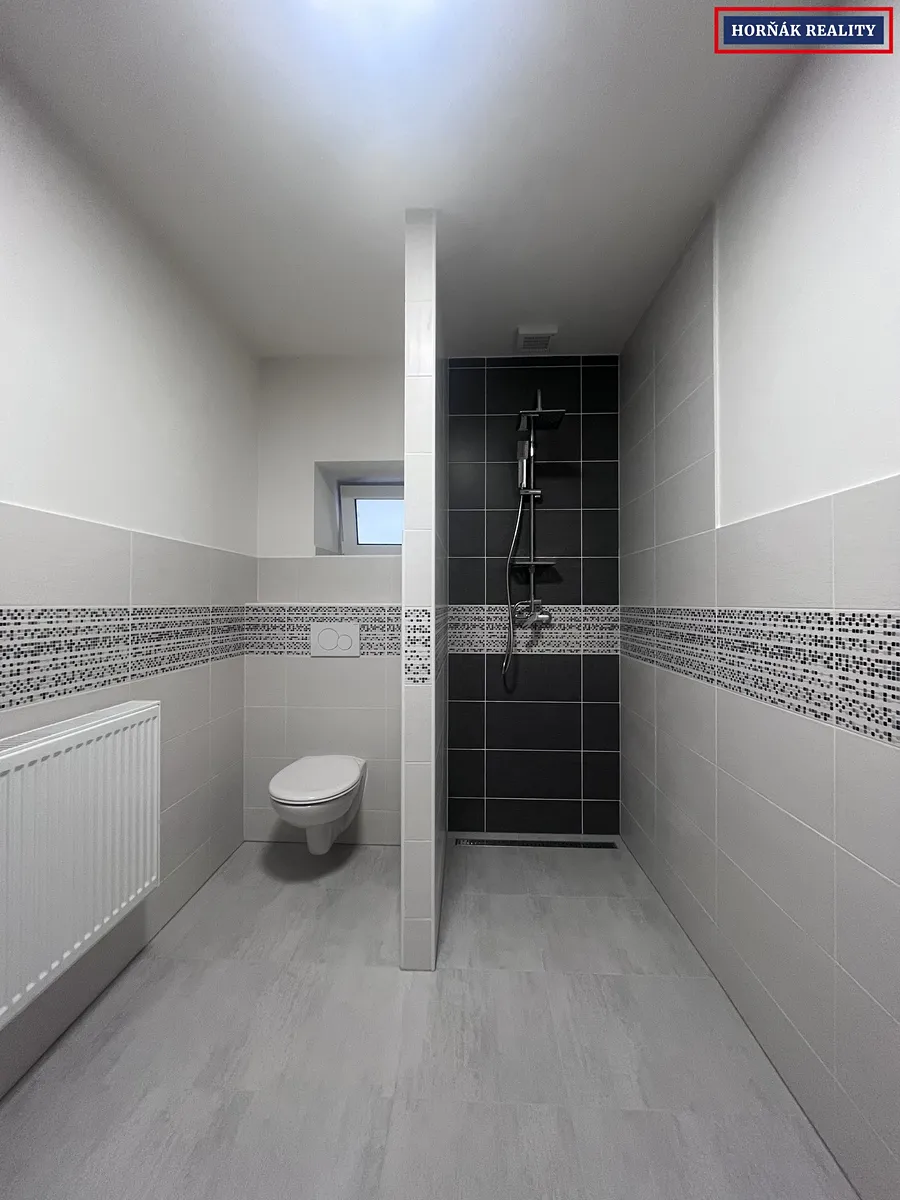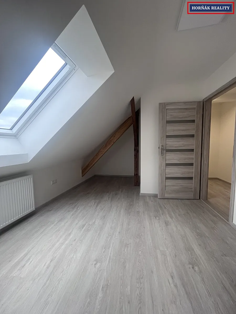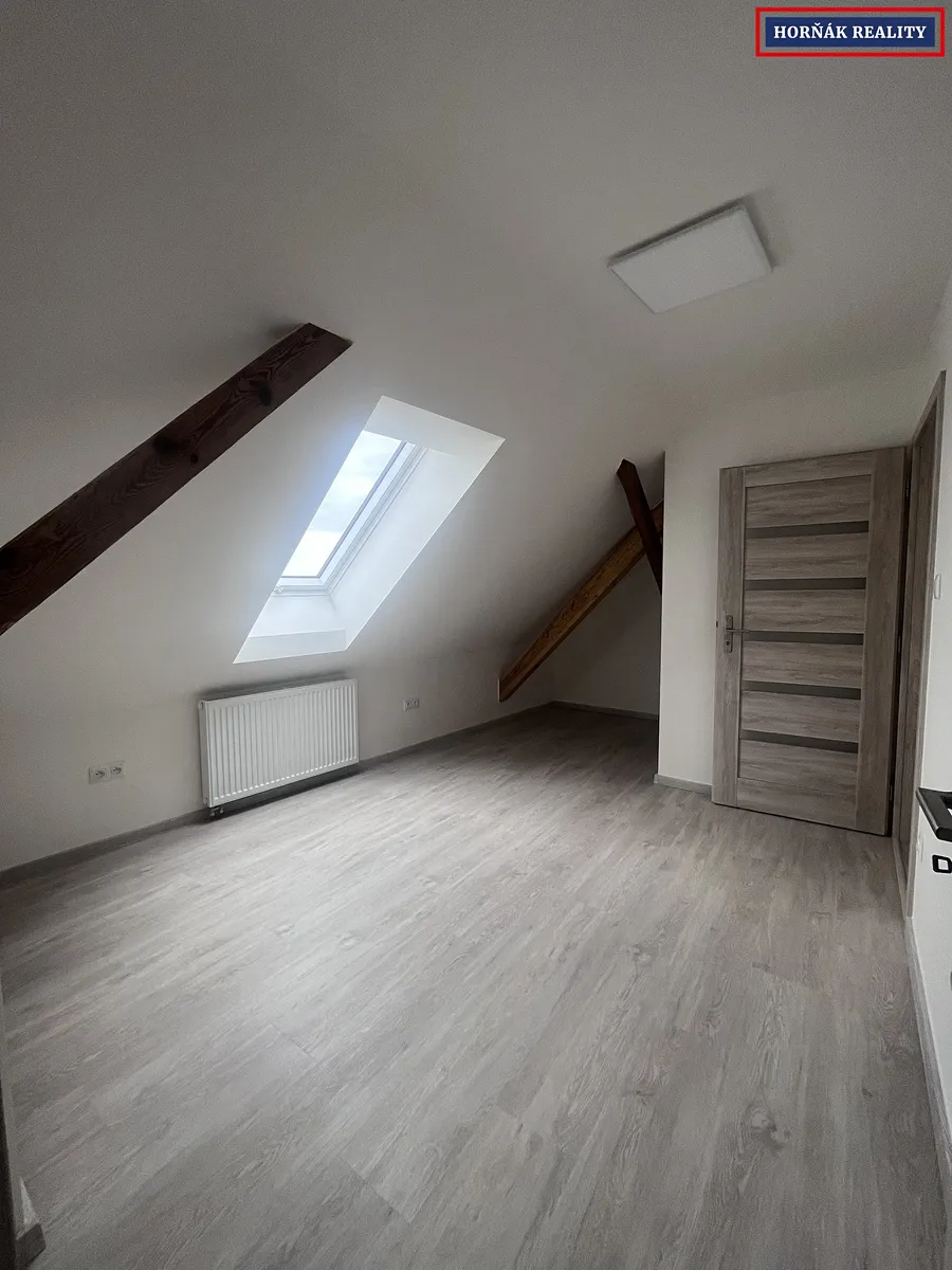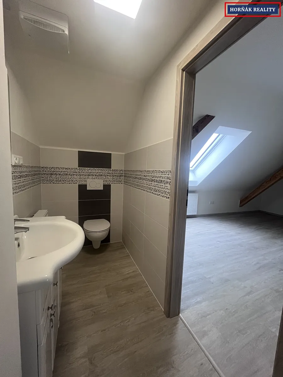 V patře jsou umístěny dva samostatné pokoje a druhá koupelna s WC.