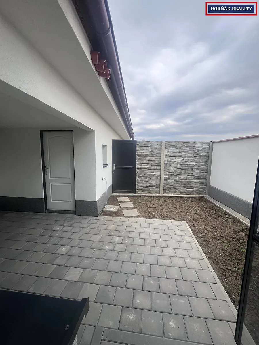 K domu náleží menší zahrádka, na kterou je vstup z kuchyně. Na zahradě se nachází praktická místnost, vhodná pro uskladnění kol, zahradního nábytku nebo nářadí. Parkování pro jeden automobil je možné přímo u domu.