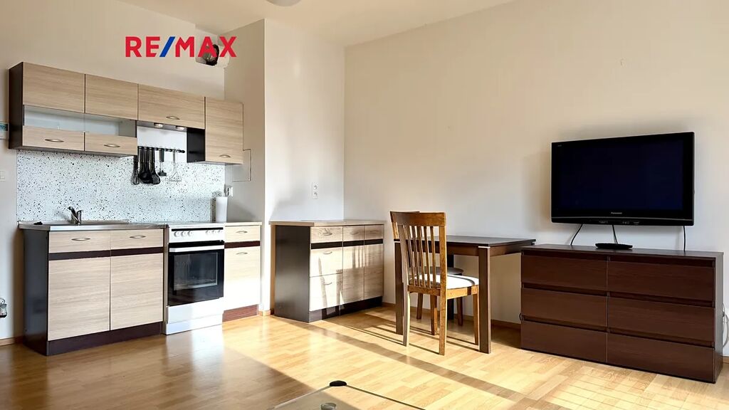 Byt je zařízený - obývací pokoj s plně vybavenou kuchyňskou linkou (jako jsou trouba, varná deska, malá lednice); jídelní stůl se židlemi, komoda, rozkládací pohovka, velká skříň, televize, konferenční stolek; skříň v chodbě, dále koupelna se sprchovým koutem, WC a pračkou. Nechybí tady ani balkon s výhledem do klidného vnitrobloku.