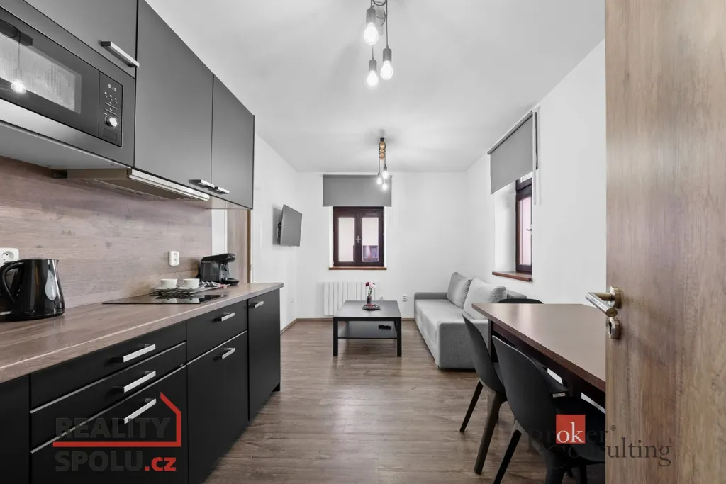 V přízemí najdete apartmán o dispozici 2+kk a o výměře 47,94 m², který je kompletně zrekonstruovaný, moderně zařízený a plně automatizovaný. Zůstává také plně vybaven a je tak připravený k okamžitému užívání, aktuálně úspěšně funguje v krátkodobých pronájmech. Nový majitel tak může pokračovat v zaběhnutém provozu, ať už formou krátkodobého či dlouhodobého pronájmu. V prvním patře se nachází druhý byt o dispozici 2+kk a velikosti 47,4 m², který by zasloužil rekonstrukci a nabízí tak možnost úprav podle vlastních představ.