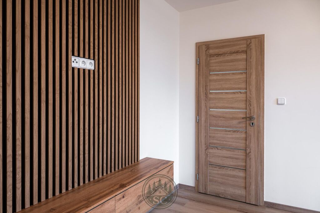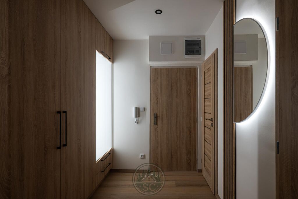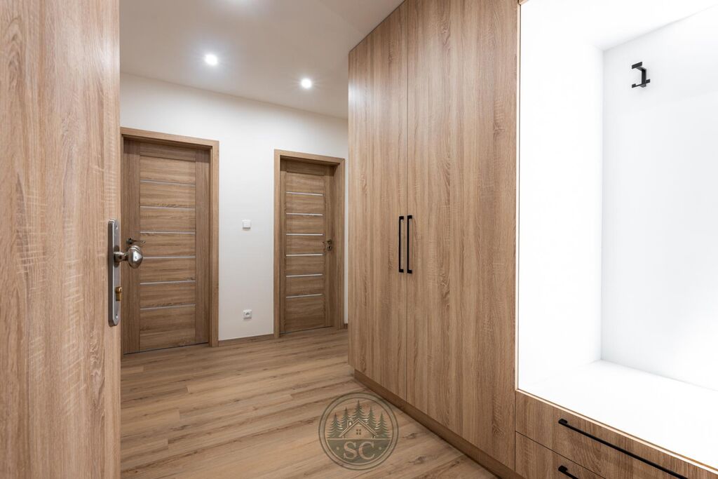 V obývacím pokoji je připravena stěna pro TV - kabel i zásuvky jsou zabudované přímo ve stěně, v předsíni osvětlená vestavěná skříň s prostorem na umístění sušičky.