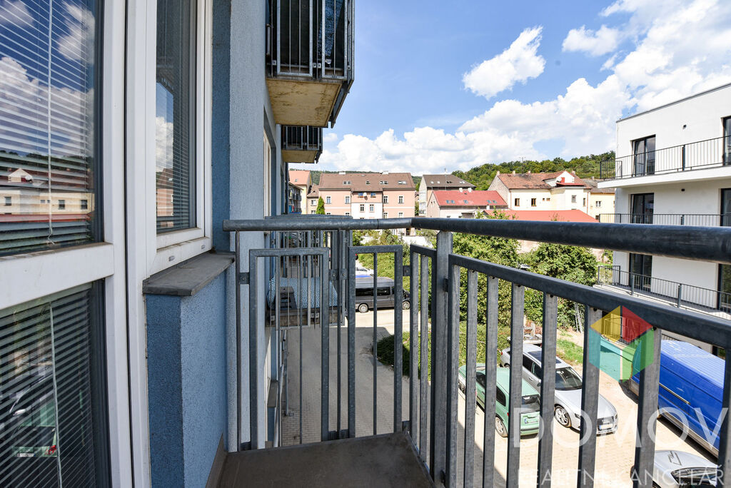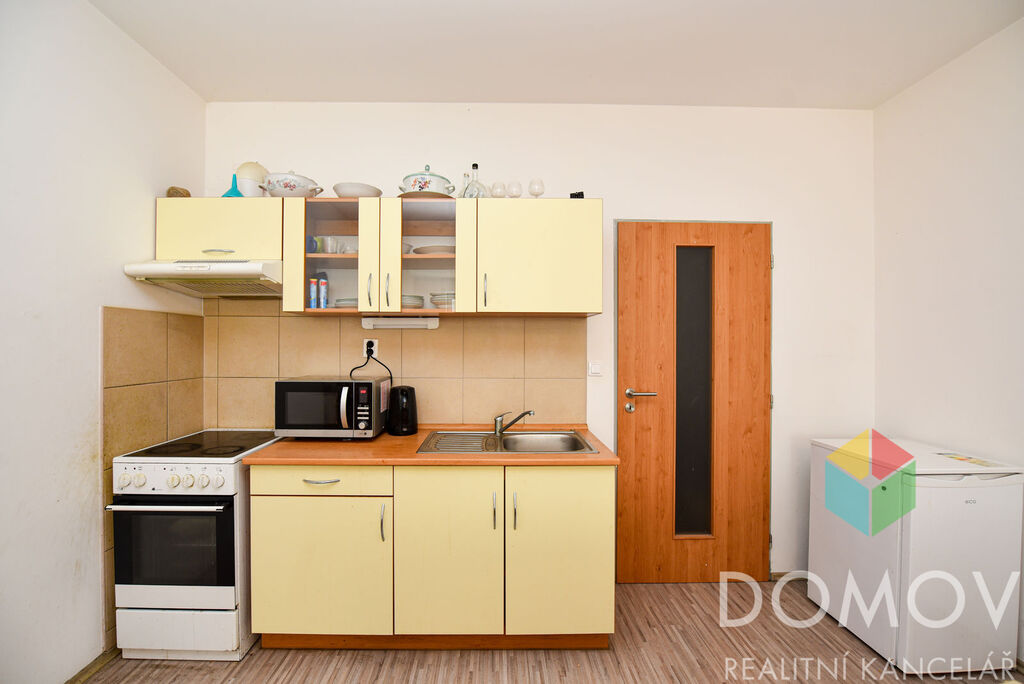 Na obývací prostor s kuchyňským koutem navazuje balkon o velikosti 1,8 m2. Na fotkách je nábytek předchozího nájemce, nyní je byt prázdný. V koupelně s toaletou je dále vana a umyvadlo. Kuchyňský kout je vybaven sklokeramickou varnou deskou, troubou adigestoří. Okna jsou plastová, na podlaze lamino.
