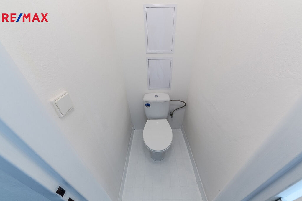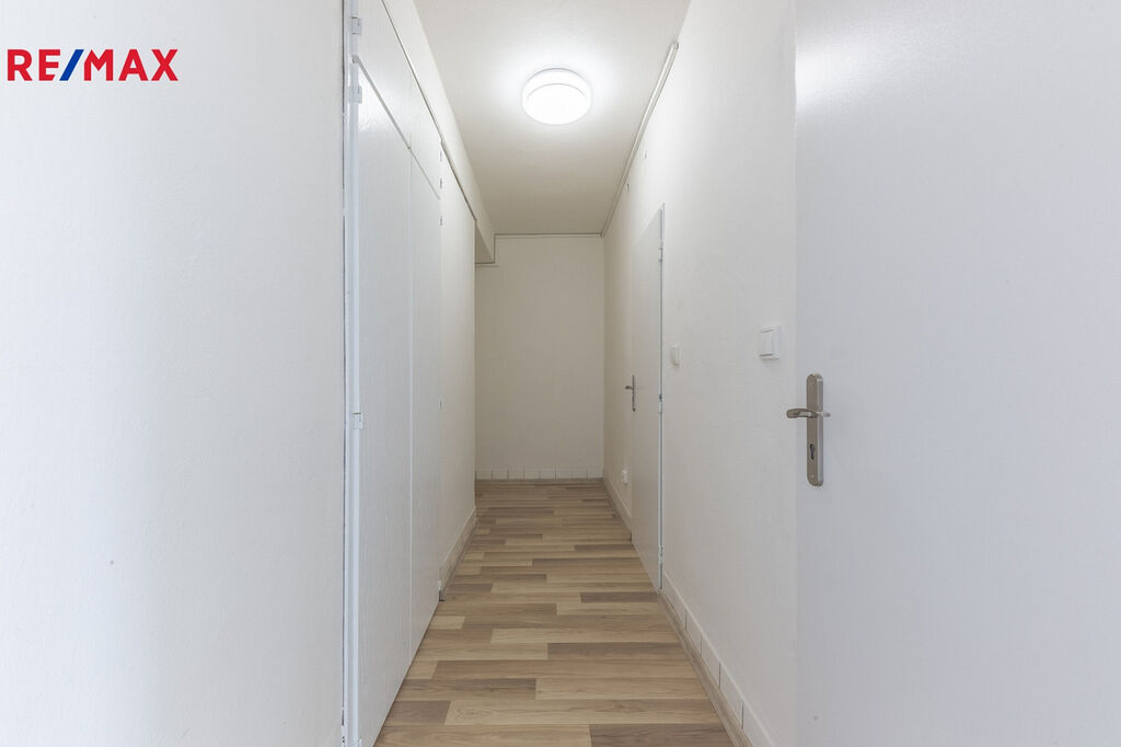 V koupelně je velký sprchový kout a pračka. Na chodbě je menší vestavěný úložný prostor, kam lze doplnit police podle potřeby.