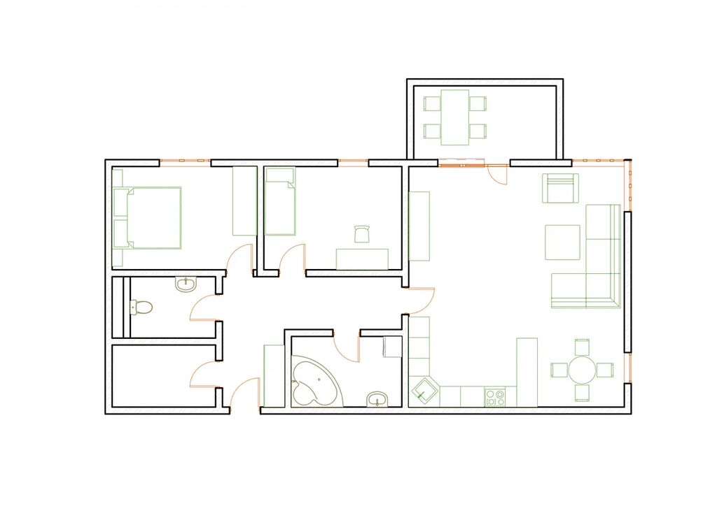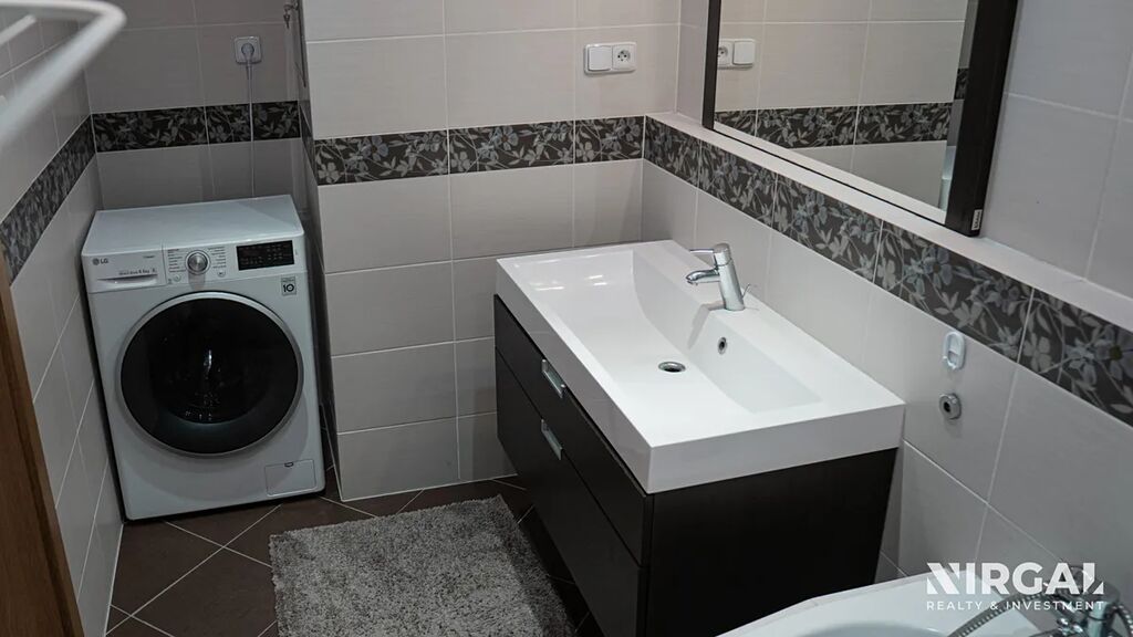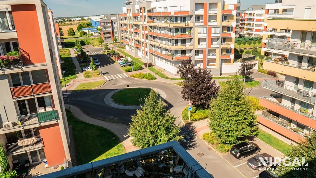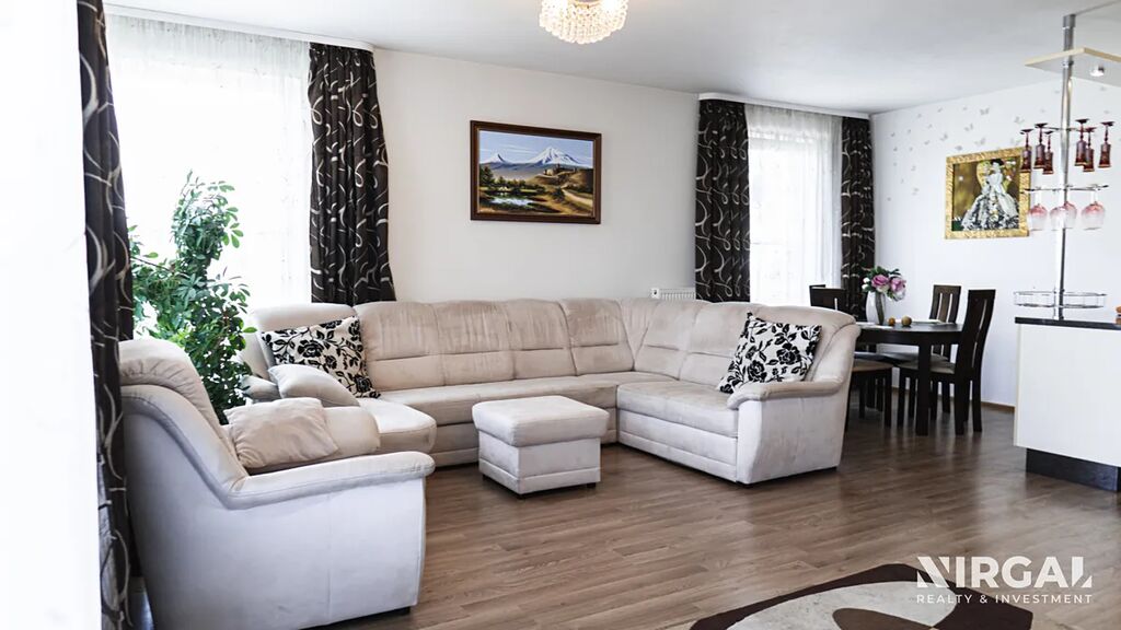 Z předsíně s velkým úložným prostorem a komorou vstoupíte do všech místností. Prostorný, klimatizovaný obývací pokoj má velikost 38,7m2 a jeho součástí je kuchyňský kout a vstup na balkón. Moderní kuchyňská linka je vybavená lednicí s mrazákem, sklokeramickou varnou deskou, elektrickou troubou a digestoří. Dva další pokoje jsou samostatné. Koupelna s vanou má podlahové vytápění. Samostatná toaleta.