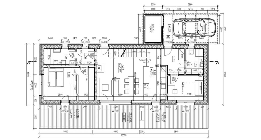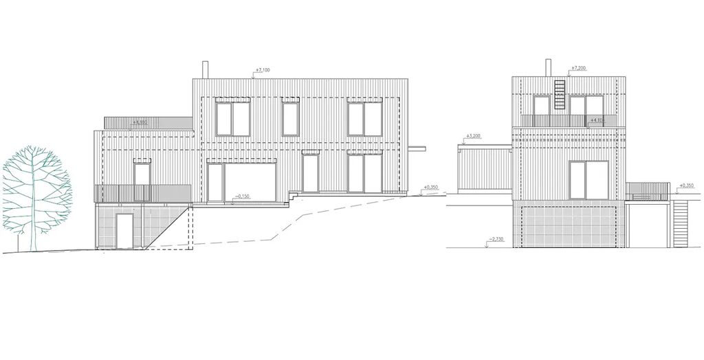 • Povolený RD má dispozici 5+ KK a užitnou plochu 181 m2 + cca 60 m2 teras, lze individuálně úpravit.