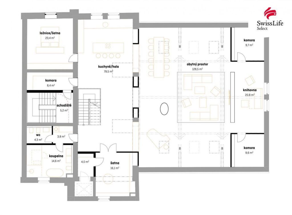 Horní podlaží lze dokončit podle potřeb nového majitele jako kancelářské prostory, ateliéry nebo zázemí firmy. Na boku objektu se nachází malá garáž a technická místnost s přípravou pro další technologie.