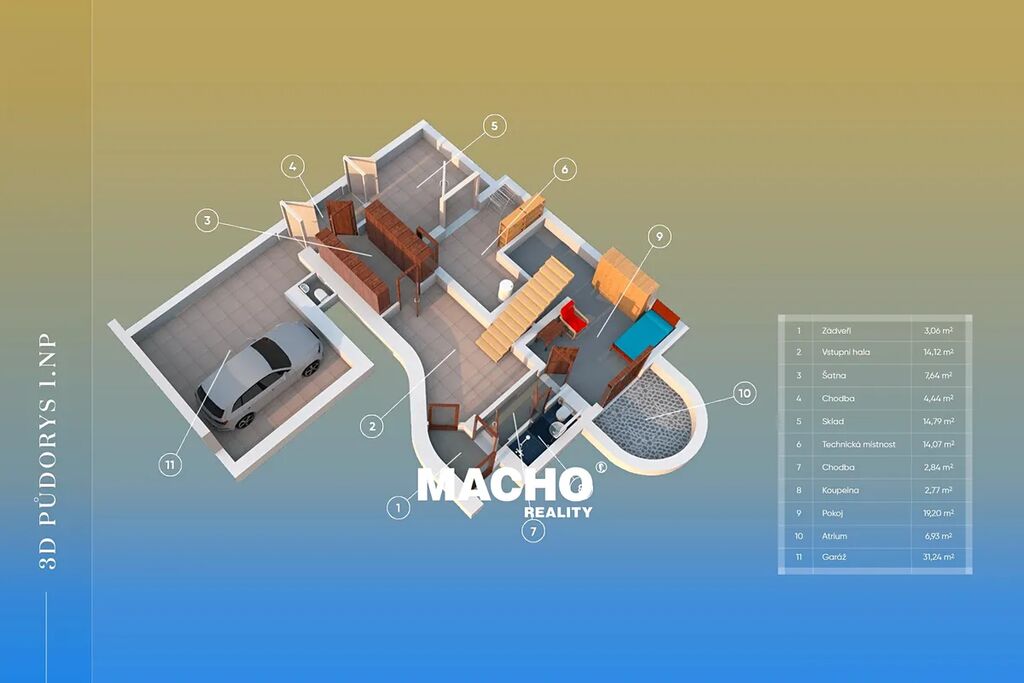 V 1. nadzemním podlaží se nachází menší útulný byt s pokojem, spacím prostorem a koupelnou se sprchovým koutem a toaletou. Dále se na podlaží nachází prostorná chodba, technická místnost s novým kotlem k tepelnému čerpadlu, skladový prostor s přístupem do garáže, a další samostatná toaleta. Zajímavě řešené venkovní atrium poslouží jako odpočinková zóna v horkých letních dnech.