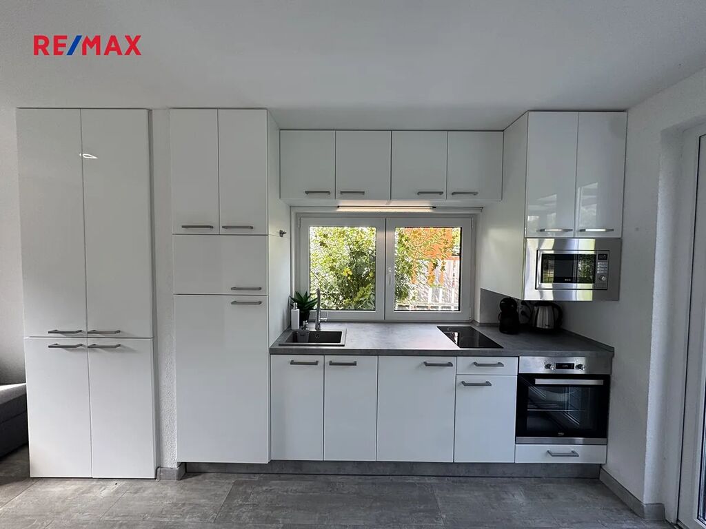 moderní kuchyňská linka s vestavěnými spotřebiči (trouba, varná deska, mikrovlnka, lednice)