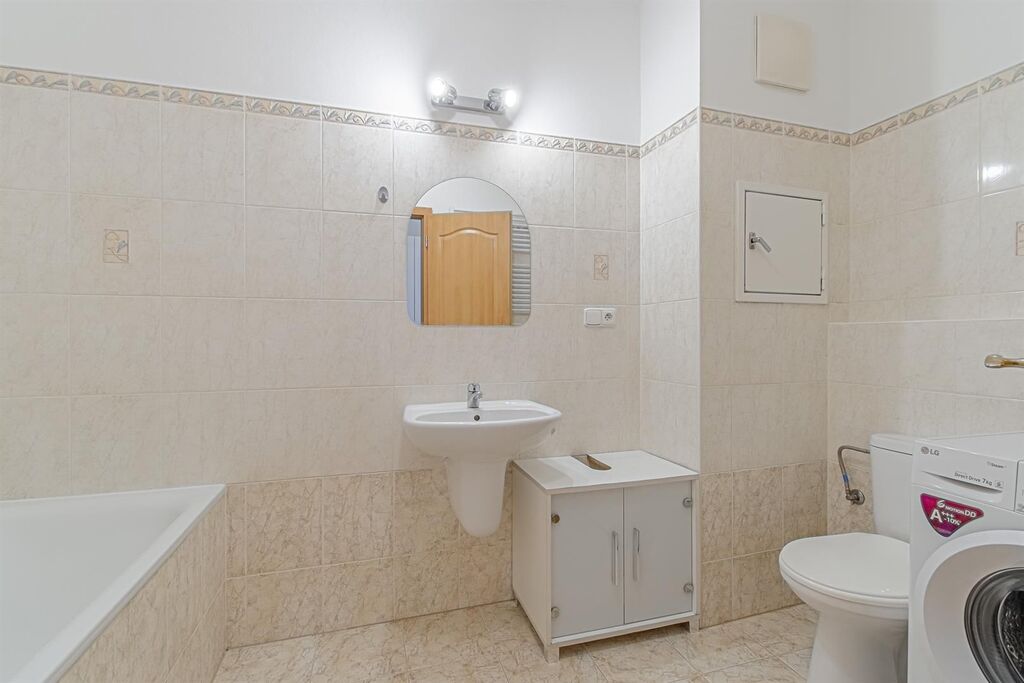 Prostorná koupelna s vanou a místem pro pračku/sušičku, chodba s prostornými skříněmi úložné prostory.