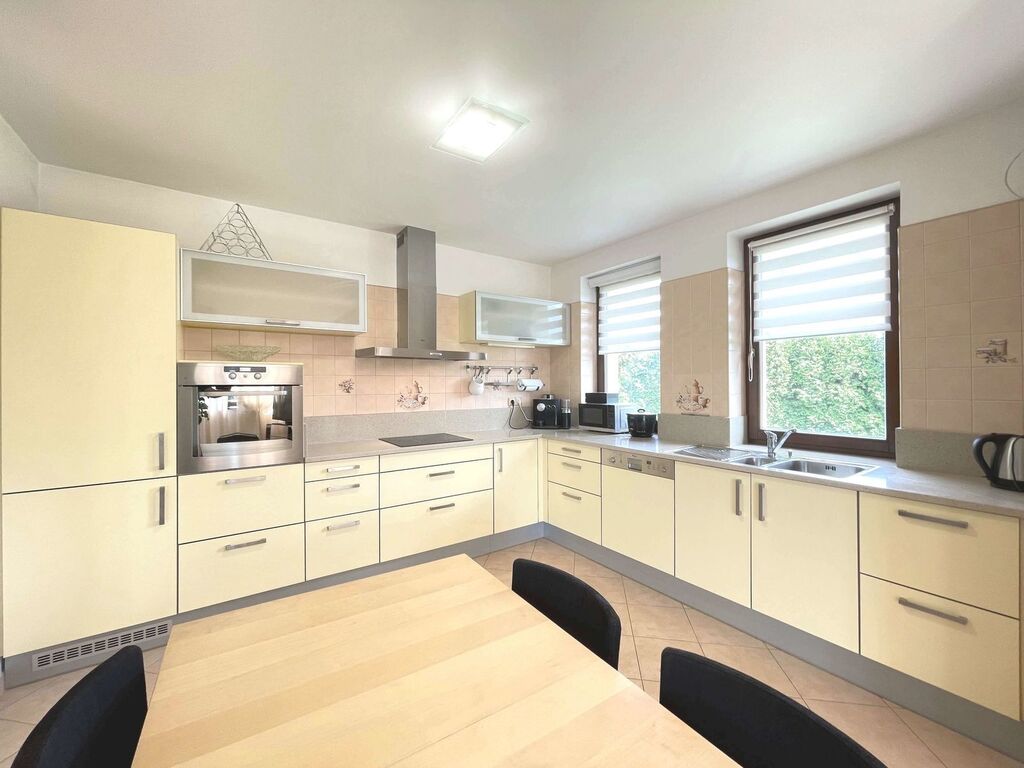 • Přízemí: garáž, vstupní chodba, předsíň se šatnou a komorou, pokoj pro hosty, obývací pokoj s krbem propojený s plně vybaveným kuchyňským a jídelním koutem; velkoformátová francouzská okna na terasu a zahradu; koupelna se sprchou, WC a pračkou.
