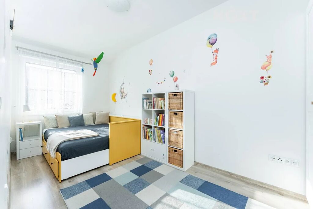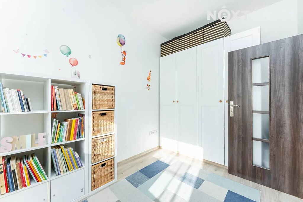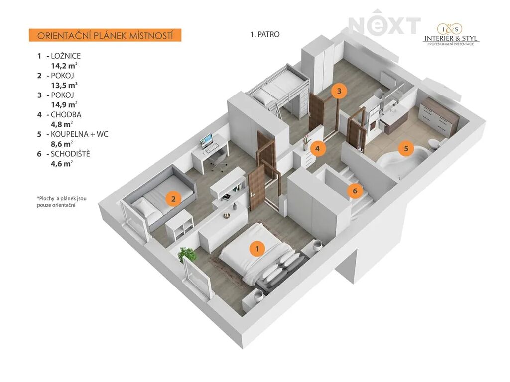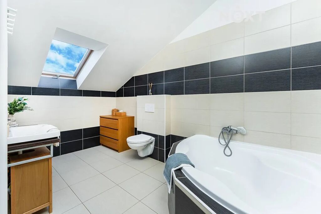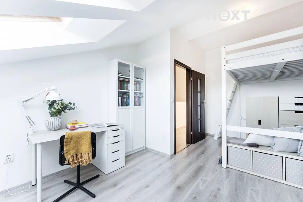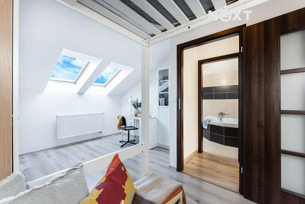 V patře se nachází ložnice, dva dětské pokoje a druhá koupelna s WC. Celý dům působí velmi vzdušně, je dobře dispozičně řešen a nabízí dostatek úložného prostoru.