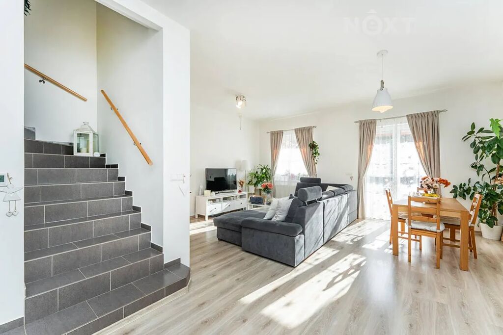 V přízemí domu vás přivítá prostorná vstupní hala, z níž se vstupuje do světlého obývacího pokoje s kuchyňským koutem, který je přirozeným centrem celého domu. Na obývací prostor navazuje terasa s výhledem do zeleně – ideální místo pro ranní kávu či večerní posezení s rodinou. Dále zde najdete pracovnu, komoru a koupelnu s toaletou.
