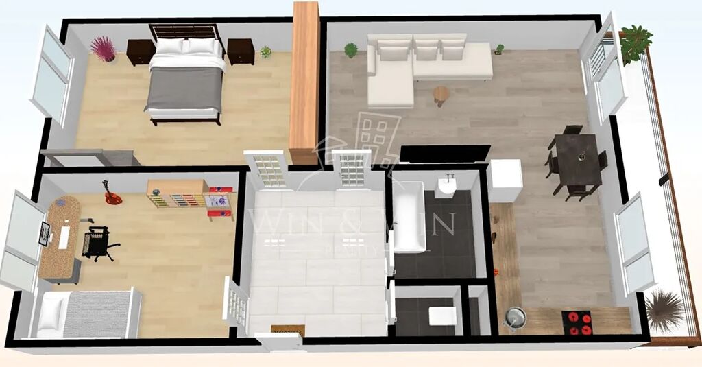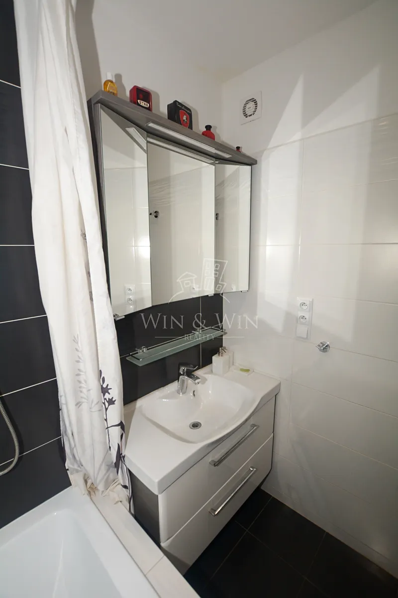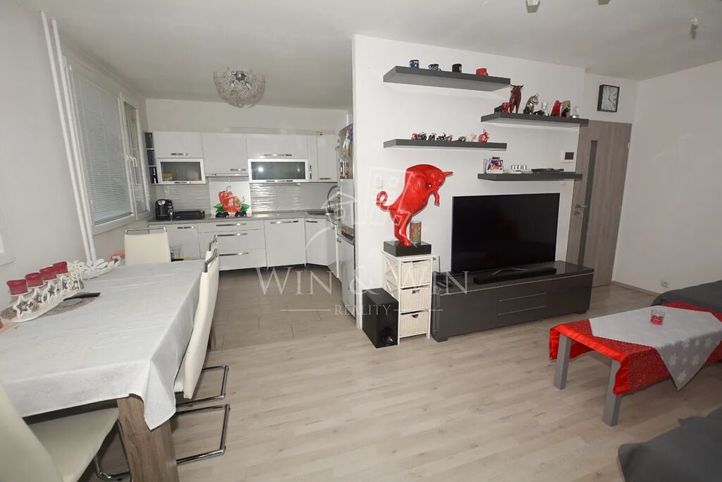 Dispozice bytu je tvořena obývacím pokojem s jídelnou a kuchyní, koupelnou, toaletou, chodbou, světlou ložnicí, dětským pokojíčkem a velkou zasklenou lodžií. Každou ženu jistě zaujme kuchyňská linka Oresi s praktickými zabudovanými spotřebiči včetně pračky, myčky na nádobí, vestavěné trouby a kvalitní plynové desky. Bytová jednotka prošla kompletní nákladnou rekonstrukcí a je nadstandardně vybavená. Součástí vybavení jsou vestavěné skříně od truhláře. Ostatní nábytek který se nachází na fotografiích byl užíván pouze majiteli a bude odvezen. Bytová jednotka je pod dvojím uzamčením (mříže před bytem ) a má k dispozici sklep přímo vedle bytu.