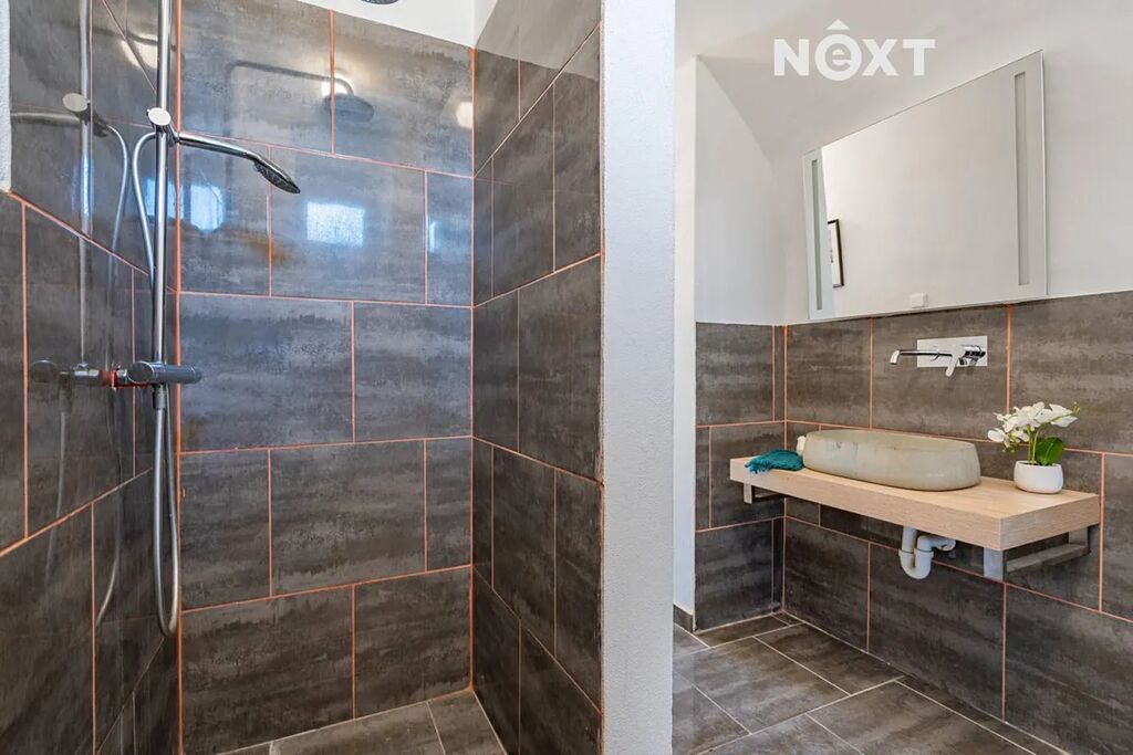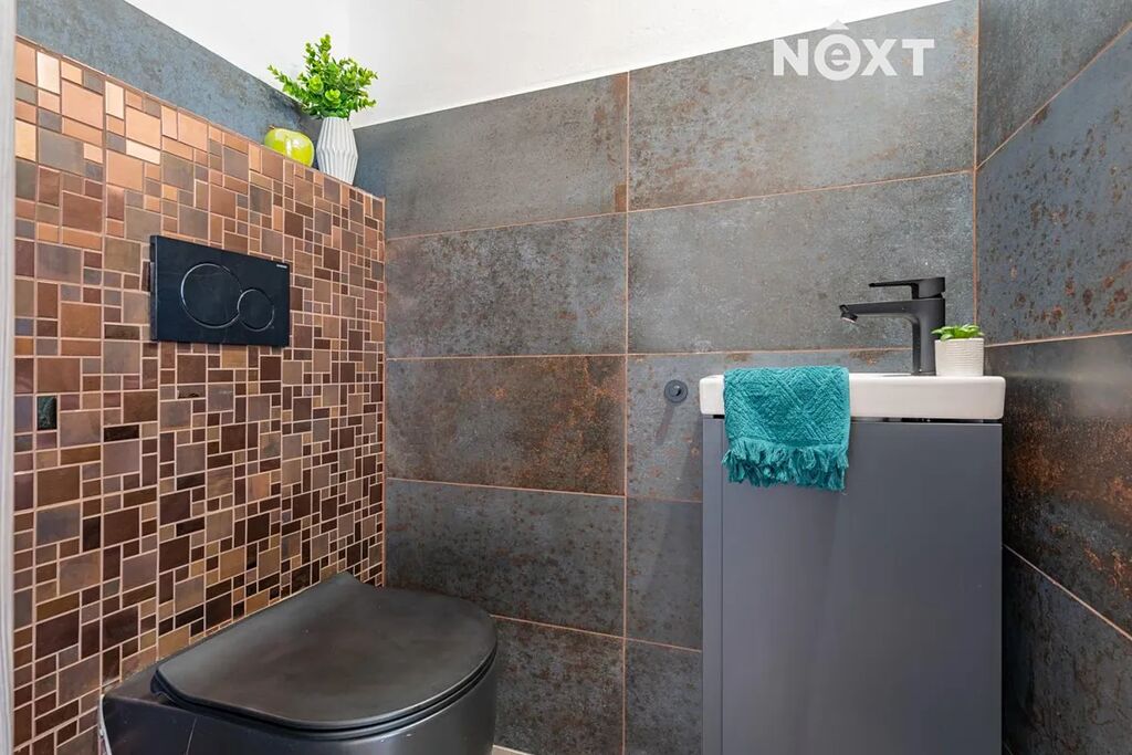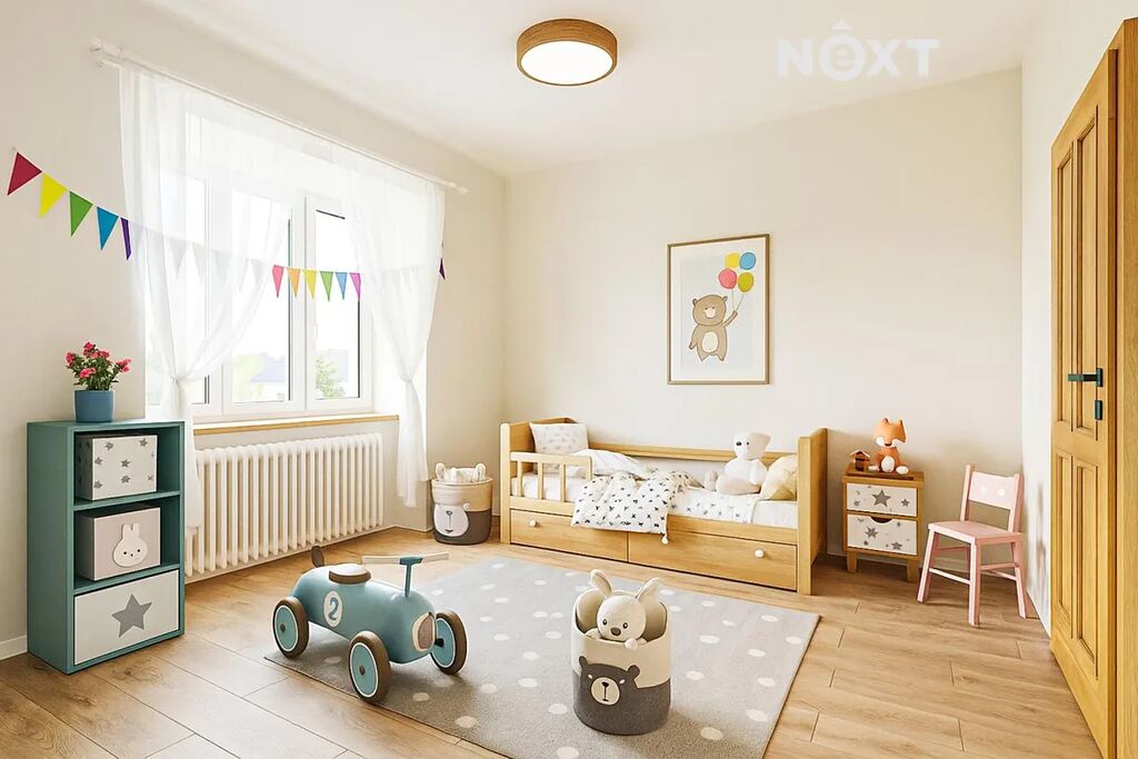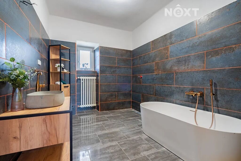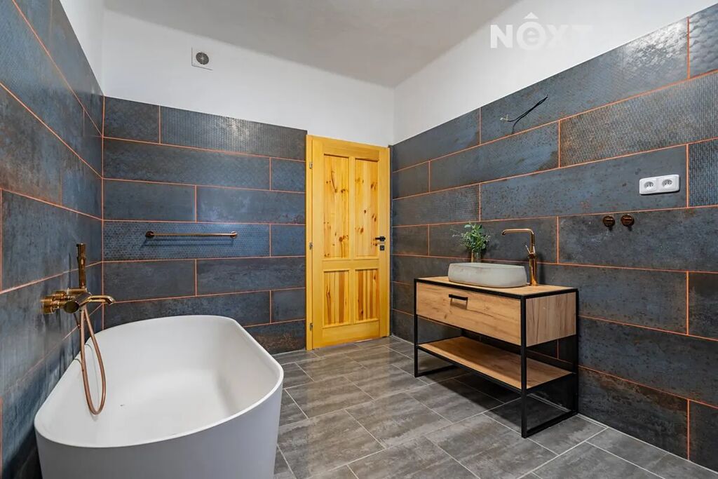 Horní patro nabízí tři ložnice (jednu lze využít jako pracovnu či šatnu), prostornou koupelnu s vanou i sprchovým koutem a velký obývací pokoj s přípravou na kuchyňskou linku a místem pro krbová kamna, která vytvoří pravou domácí atmosféru. Podlahy jsou řešeny dlažbou a vinylem, koupelny zdobí velkoformátové obklady a použity jsou někde i kvalitní baterie Hans Grohe. Interiérové dveře ve spodní části domu jsou značky Sapeli, v horním patře dřevěné masivní dveře vyráběné na míru – vše do posledního detailu sladěno v jednotném stylu.
