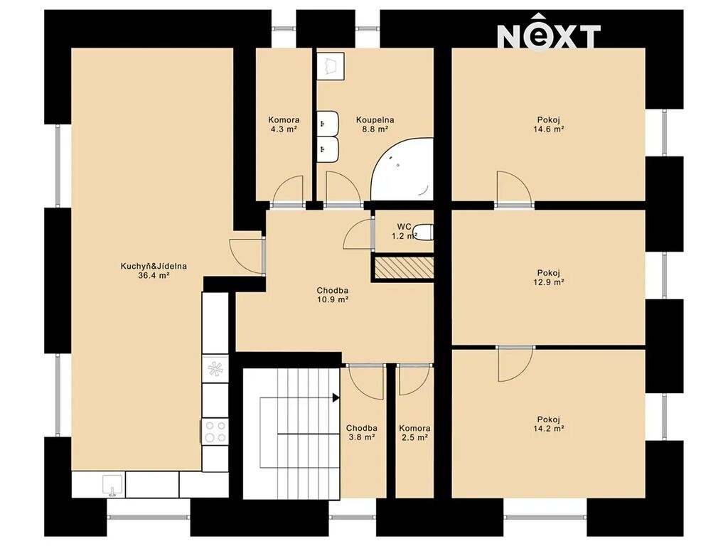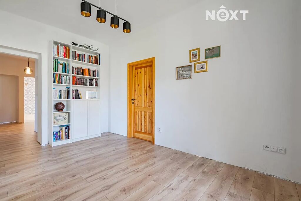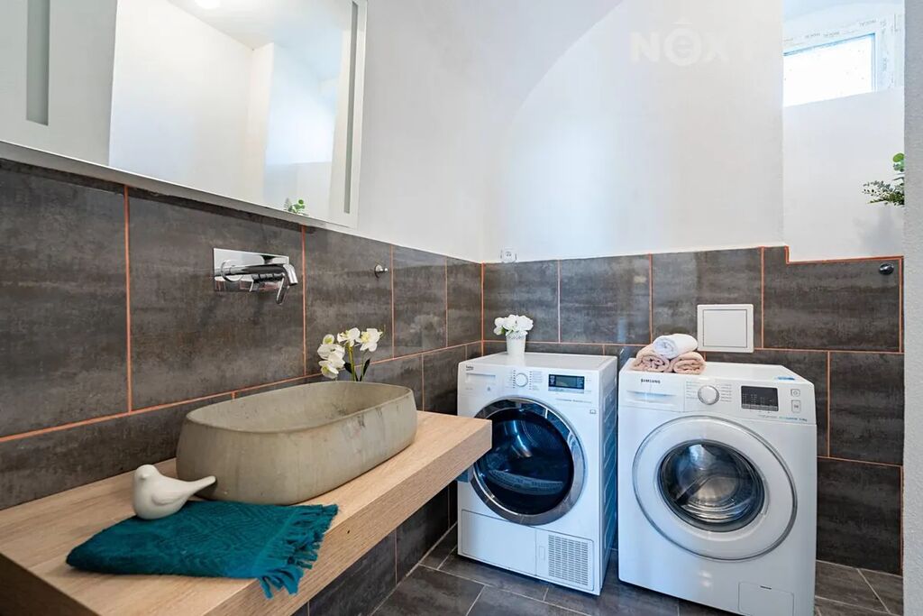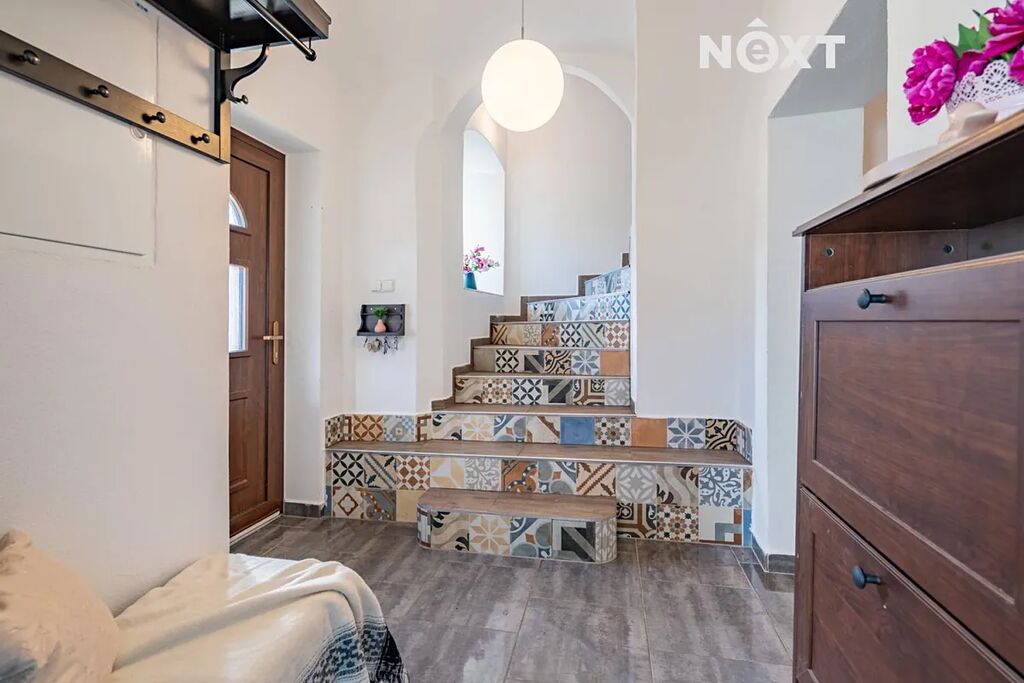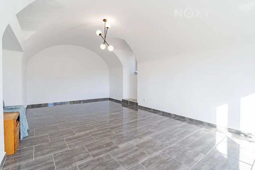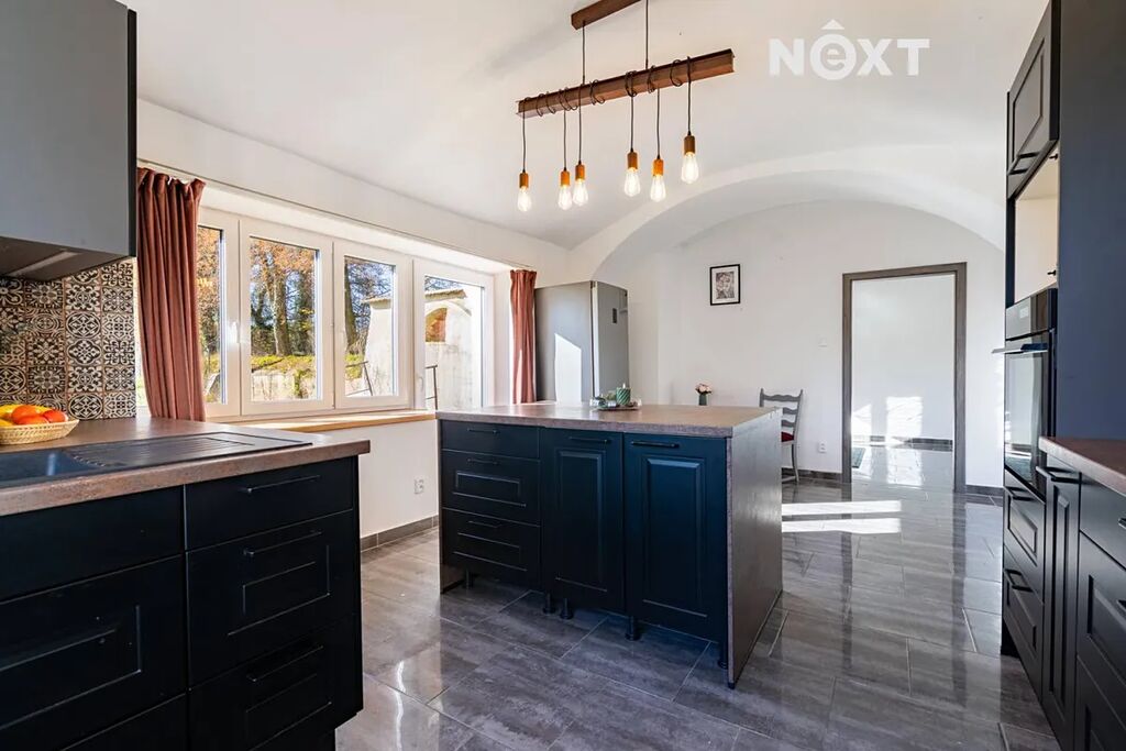 Dům je koncipován jako dvougenerační 3+KK (103 m2) a 4+KK (109 m2), tedy se dvěma samostatnými bytovými jednotkami s jedním vchodem. V přízemí se nachází velká kuchyň na míru s výhledem do zahrady a přímým vstupem na terasu, kde se počítalo s prostorem pro velkou terasu a bazén. Dále zde najdete obývací pokoj (či ložnici), jídelnu, technické zázemí, samostatné WC a koupelnu se zděným sprchovým koutem a prostorem pro pračku a sušičku. Interiér přízemí působí velmi útulně, a to i díky zachovaným klenbám, které domu dodávají charakter a eleganci.