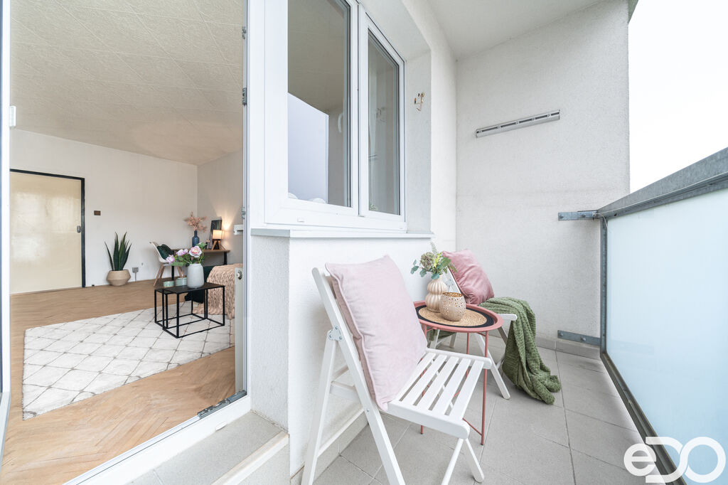 K bytu náleží balkon, perfektní místo pro ranní kávu nebo večerní odpočinek, a také sklepní kóje, kde bez problému uložíte vše, co nechcete mít doma.
