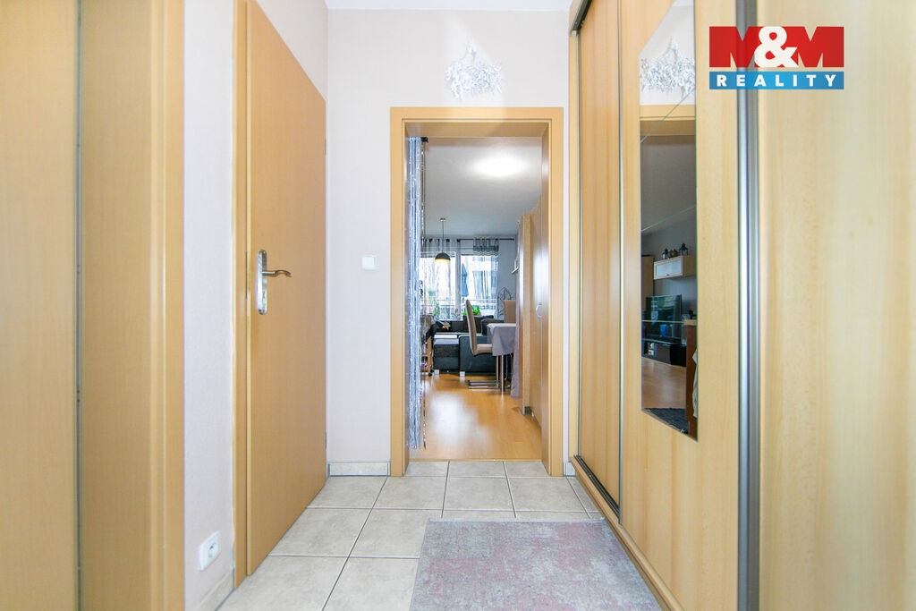 V bytě najdeme kuchyňskou linku se spotřebiči, vestavěnou skříň, věšákovou stěnu a botník.