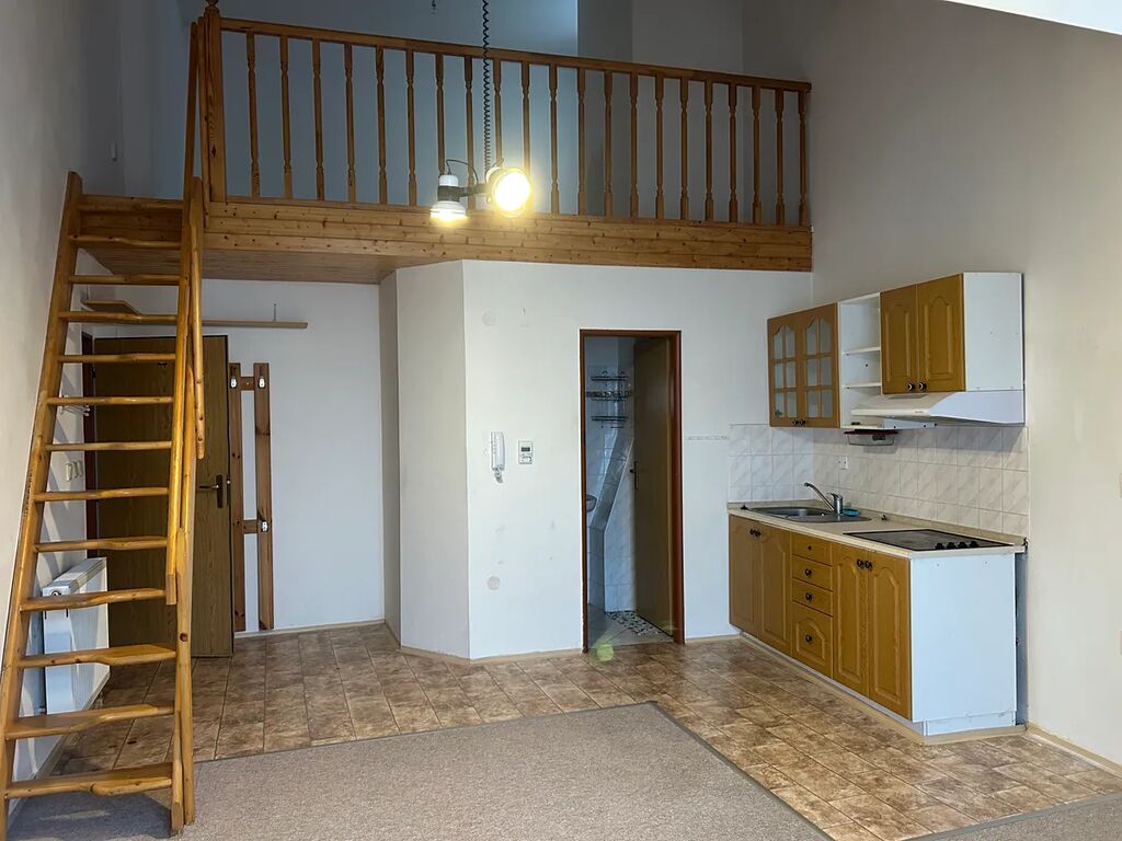 Byt se skládá z prostorné obytné místnosti s kuchyní, mezipatrem, koupelnou se sprchovým koutem a toaletou.