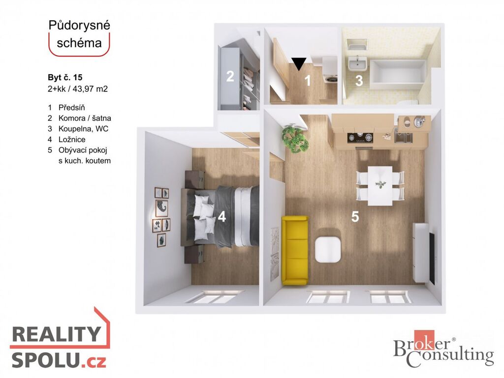 Bytová jednotka se skládá z obývacího pokoje s kuchyňským koutem. Na něj navazuje samostatná ložnice zajišťující dostatek soukromí a klidu. Koupelna je vybavena vanou a WC. Výhodou této bytové jednotky je praktická komora u vstupní chodby, kterou je možné využít jako šatnu.