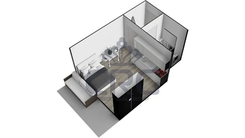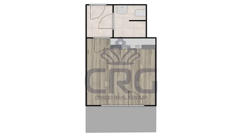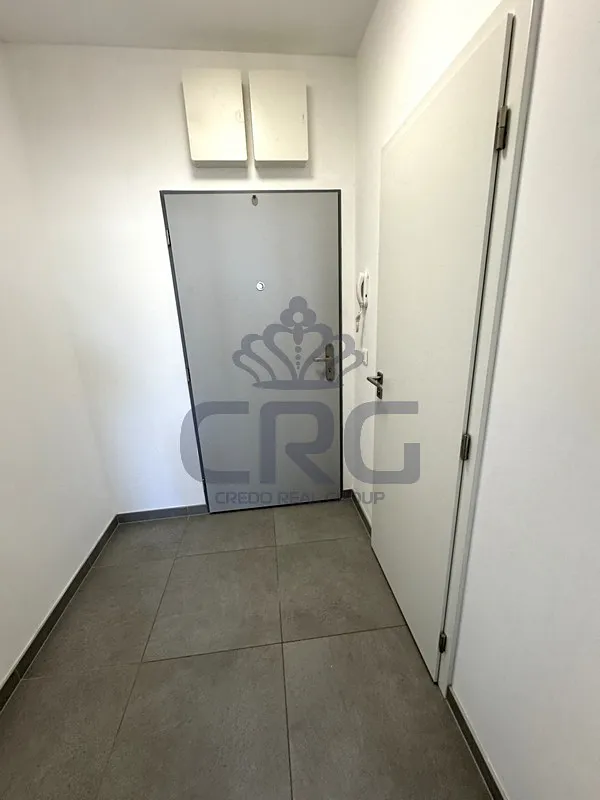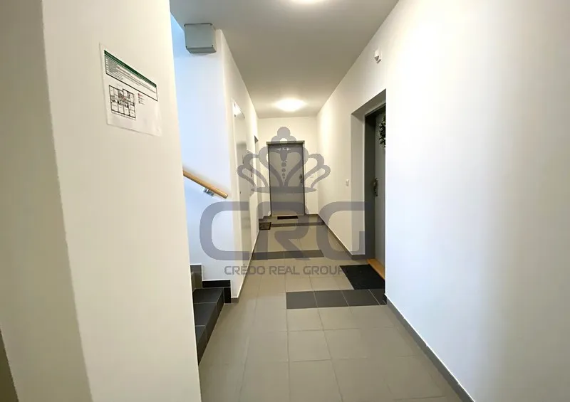 Vstupními dveřmi vejdeme do bytu a nacházíme se v chodbě o velikosti cca 3,2 m2. Z této je vstup do koupelny a do hlavní obytné části s kuchyňským koutem a terasou. Koupelna o výměře cca 3,8 m2 a je laděna do tmavších odstínů a je vybavena moderním sprchovým koutem, topným žebříkem, umyvadlem a WC.