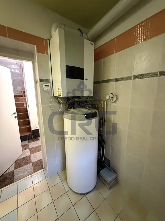 Bezpečnostními dveřmi vejdeme do předsíně o výměře cca 5,3 m2. Tato místnost je vybavena vestavnou skříní a botníkem. Ze vstupní haly vejdeme do schodišťové haly o celkové ploše cca 6,8 m2, ze které je vstup do kotelny, která zároveň slouží i jako nedokončená koupelna se sprchovým koutem a rohovou vanou. V této místnosti se také nachází plynový kondenzační kotel značky THRi-GeminoX, který zajišťuje i ohřev vody se zásobníkem cca 250 litrů. Celková plocha této místnosti činí cca 12,5 m2. Z haly je mimo jiné vstup do dvou sklepů, každý o výměře cca 12 m2. Z jednoho ze sklepů je vstup do dvou garáží, které jsou sice samostatné, ale navzájem průchozí. Jedna o výměře cca 18,7 m2 druhá cca 21,75 m2. V menší garáži je malé umyvadlo a zásobník na centrální vysavač Elektrolux, který je rozveden po domě.