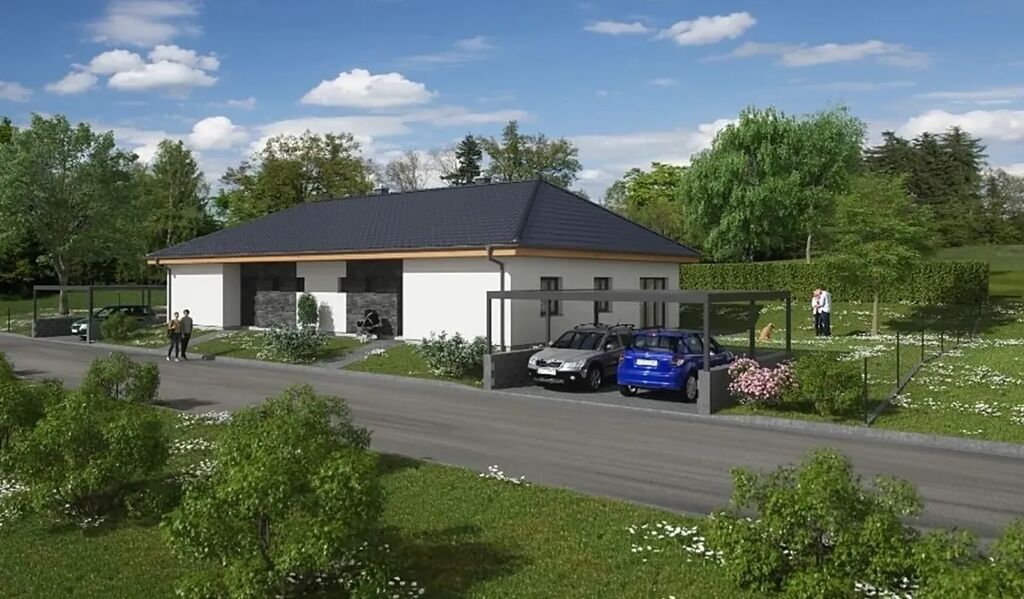 Bytová jednotka č.1 /levá polovina od příjezdové komunikace/ je dispozičně navržena jako 4+kk, obytná plocha 84 m2. Velikost jednotky je možné případně za příplatek rozšířit. Vnitřní dispoziční změny jsou zdarma.