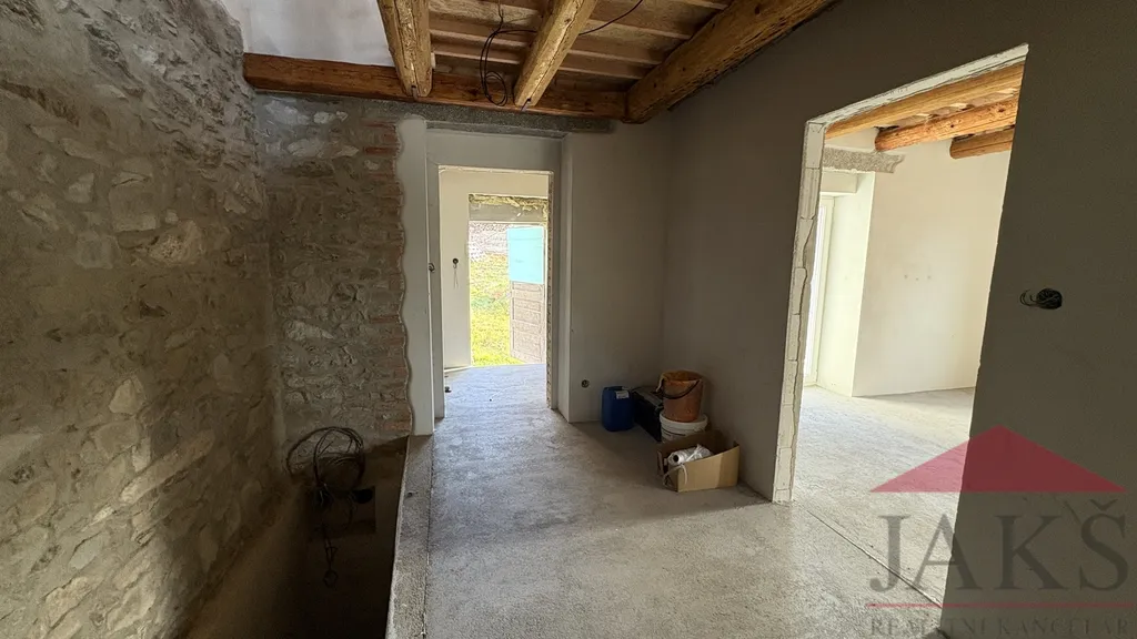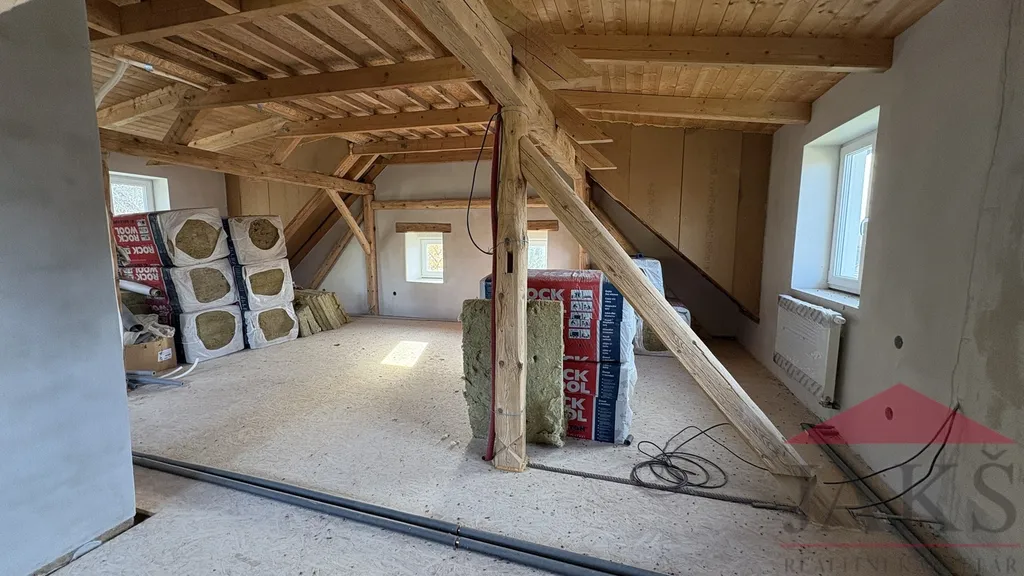 Započatá zevrubná rekonstrukce, přičemž je dokončený „obal“ a „střeva“ domu, jmenovitě: nová moderní dispozice 5+kk, střecha vč. klempířských prvků a částečně výměna krovů, vyvložkovaný nový komín, plastová okna 3-skla, strop vč. přiznaných pohledových trámů, podlahové topení v 1.NP a radiátory v podkroví vč. rozvodů v mědi, elektroinstalace vč. jističů, rozvody vody a odpadu v plastu, srovnané stěny vč. omítek, štuku a bílé výmalby, francouzské okno na budoucí terasu, srovnaná fasáda; k dokončení jsou pohledové prvky (podlahové krytiny; podhledy vč. izolace, která je v domě; příčky v podkroví, vnitřní dveře, sanita v koupelnách, osvětlení, kuch. linka...), schodiště, zdroj topení, jímka a terénní úpravy.