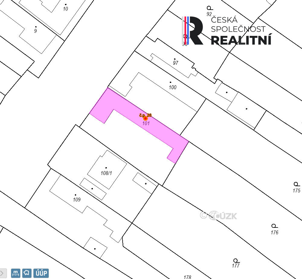 Parcela číslo 101 - zastavěná plocha a nádvoří, výměra 865m2 - součástí je stavba rodinného domu.