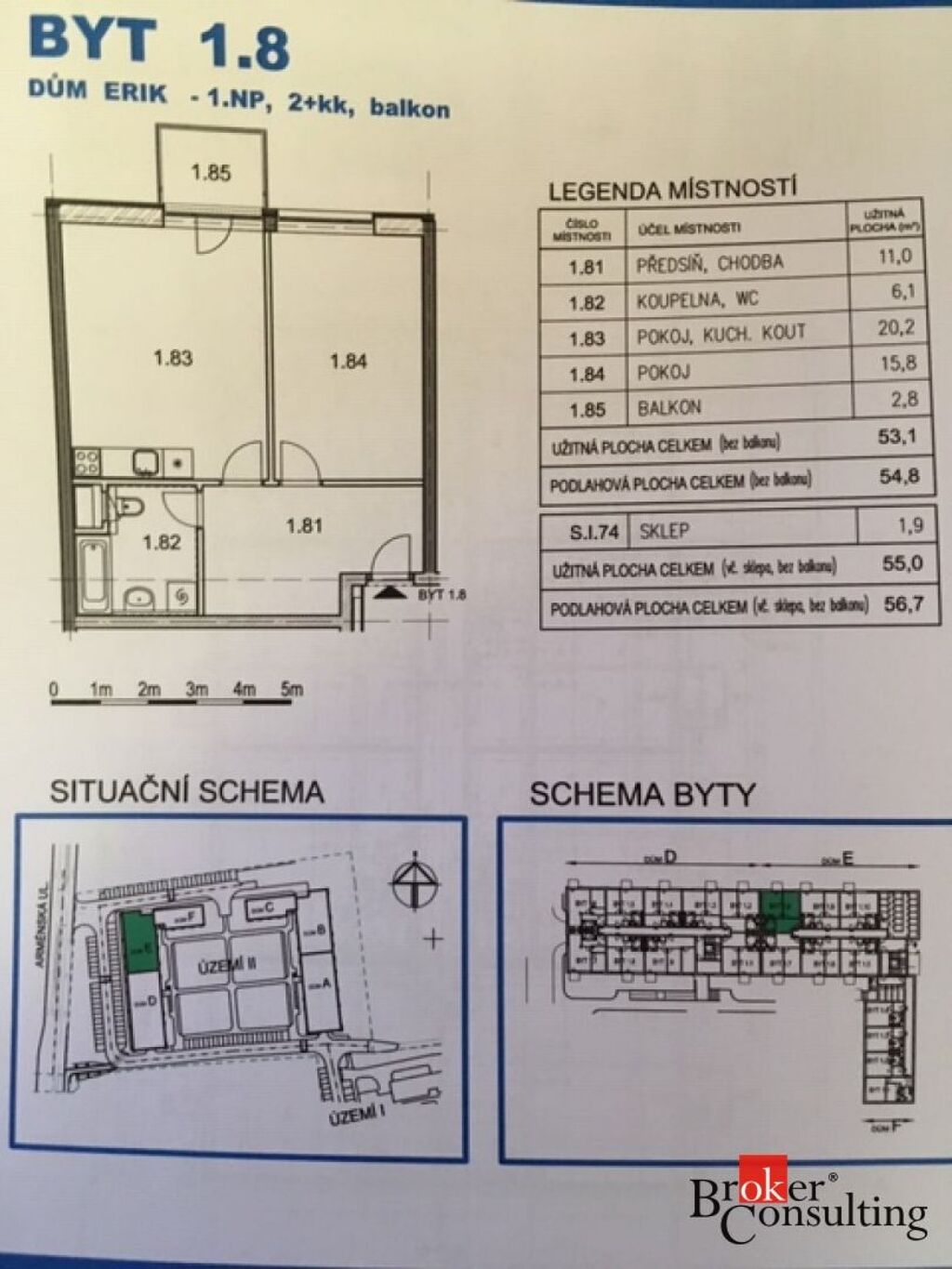 Byt se nachází v přízemí, náleží k němu sklep o velikosti 2 m2 a venkovní parkovací stání, které je ihned před balkónem. Budova se nachází v klidné lokalitě plné zeleně, v dohledu OC Oáza. V okolí je veškerá občanská vybavenost, školy, školky a výborné spojení do Prahy.
