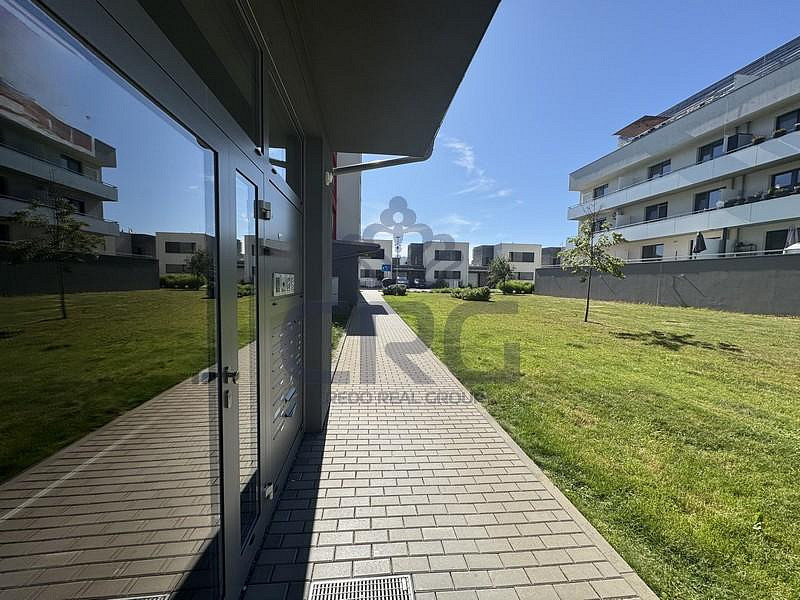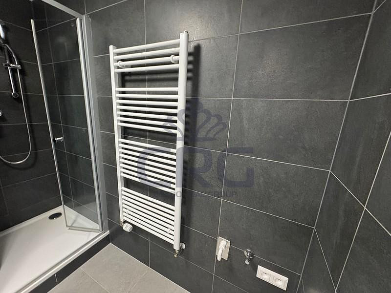 Vstupními dveřmi vejdeme do bytu a nacházíme se v chodbě o velikosti cca 3,2 m². Z této je vstup do koupelny a do hlavní obytné části s kuchyňským koutem a terasou. Koupelna o výměře cca 3,8 m² a je laděna do tmavších odstínů a je vybavena moderním sprchovým koutem, topným žebříkem, umyvadlem a WC.
