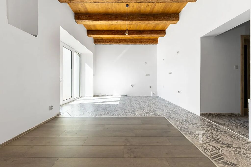 Jedná se o mezonetový byt, kde ve spodní části o dispozici 3+kk. V patře se nachází otevřený prostor, který lze rozdělit. Celková dispozice domu by mohla být až 5+kk. V horním patře se počítá s druhou koupelnou a WC. Stačí tedy jen rozdělit na jednotlivé místnosti (vrchní prostor o velikosti 87 m2).