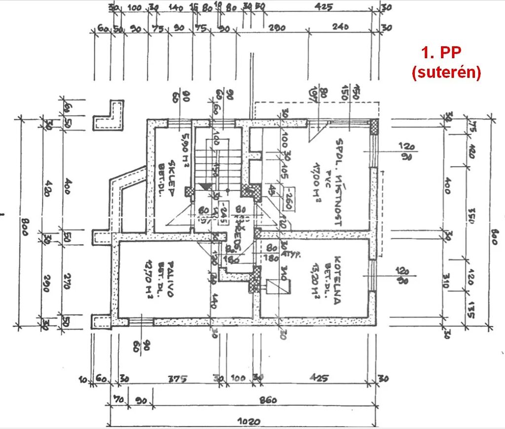 1. PP - ložnice s krbem, technická místnost s bojlerem (možno zde mít např. hernu s ping-pongovým stolem), místnost na zahradní náčiní (nebo letní kuchyň v budoucnu), další úložný prostor.