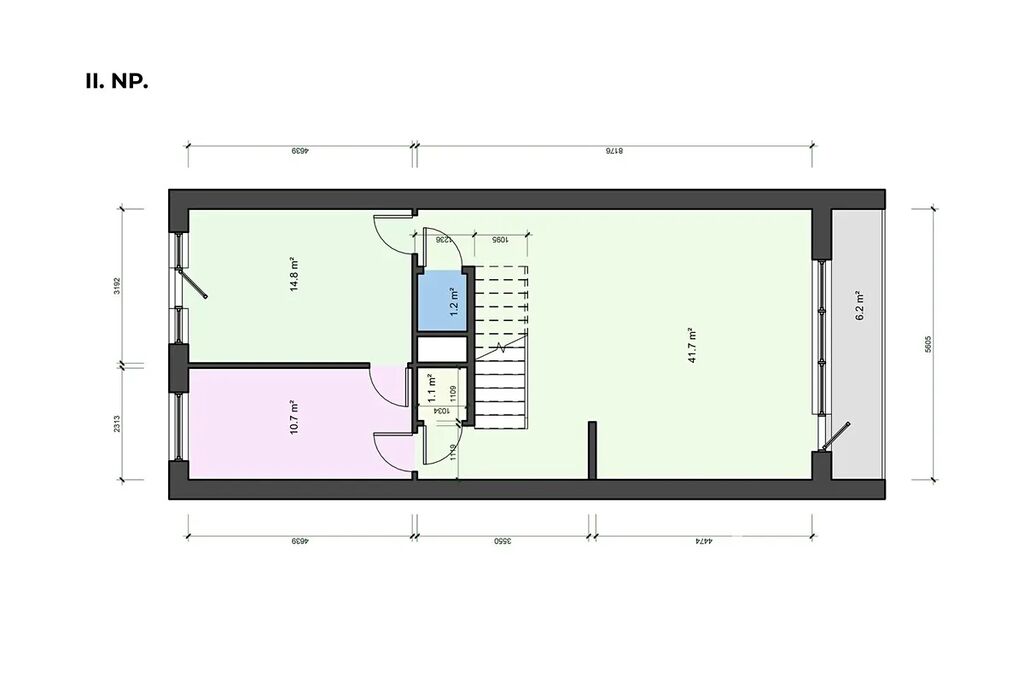 Po vystoupání dřevěného schodiště se otevírá hlavní prostor obývacího pokoje, který je velkoryse řešený a vybavený krbem pro příjemnou atmosféru. Z obývacího pokoje je vstup na východně orientovanou lodžii. Na tomto podlaží se dále nachází samostatná kuchyň a jídelna, které jsou propojené posuvnými dveřmi. I toto patro má vlastní WC. Užitná plocha 2. nadzemního podlaží činí 64,71 m², lodžie má 6,93 m².