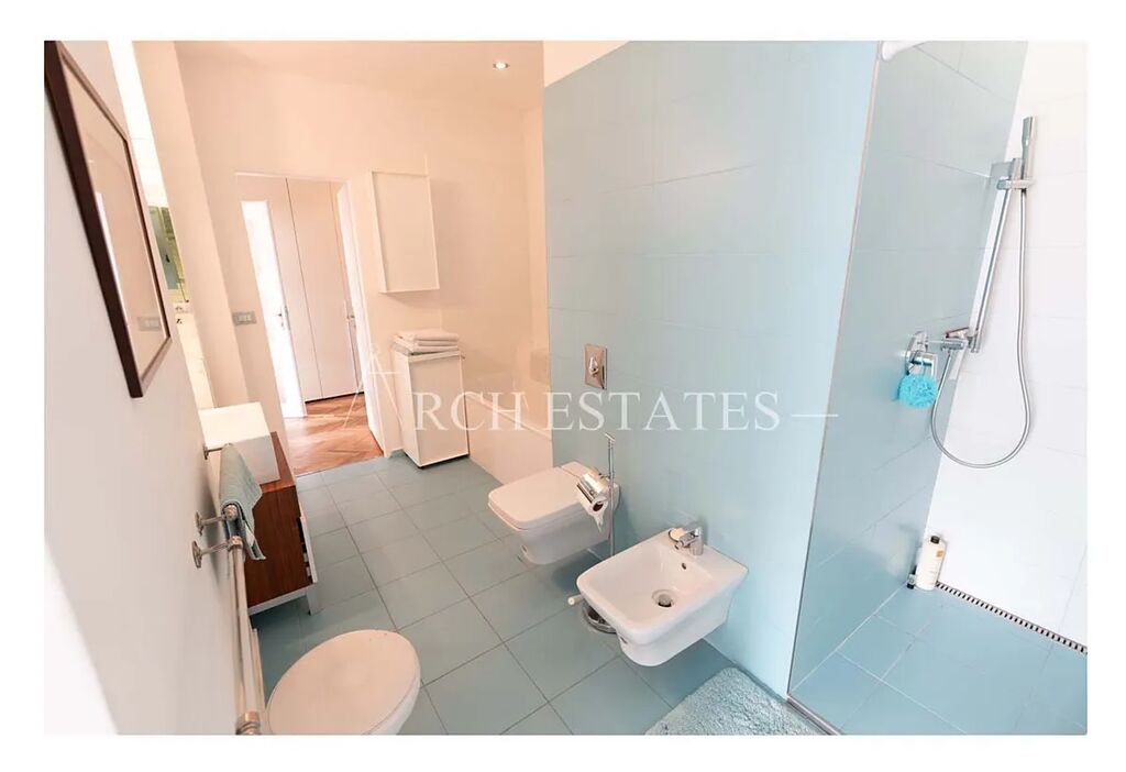 Dispozice zahrnuje otevřený obývací prostor s kuchyňským koutem, jídelnou a zónou pro relaxaci nebo práci, dvě samostatné ložnice, koupelnu s vanou, sprchou, WC a bidetem, samostatné WC a praktickou spíž/prádelnu.