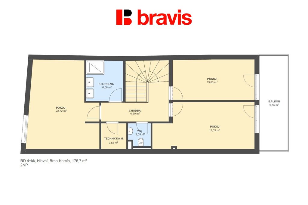 V horním patře domu jsou umístěny tři samostatné pokoje o velikosti (23 m², 18 m² a 14 m²).