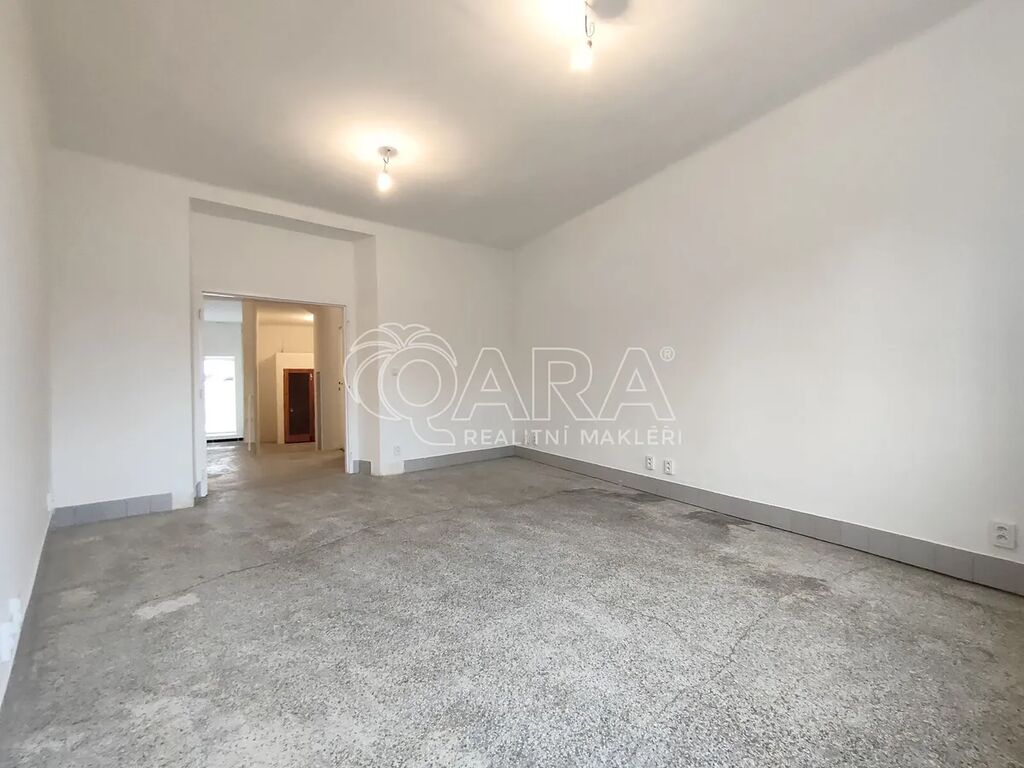V principu jsou prostory rozděleny na dvě části. První má výměru cca 114 m2 a využijete ji jako obchodní, jelikož je umístěna v přízemí se dvěma vstupy z ulice a zároveň je vytápěná ústředním topením. Druhou část pak můžete využít jako sklad, ta je umístěna v suterénu a má výměru cca 44 m2. V zázemí je základní kuchyňka a toaleta.