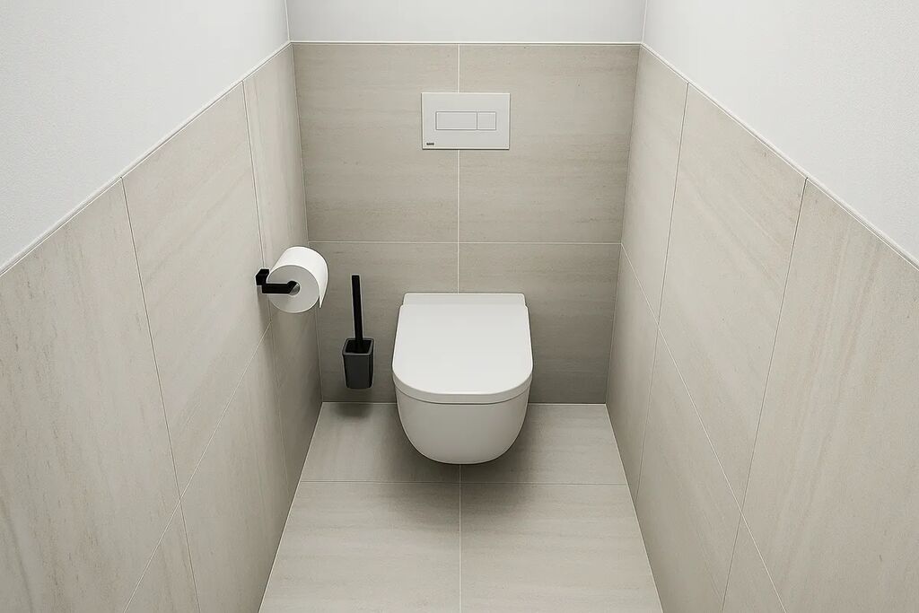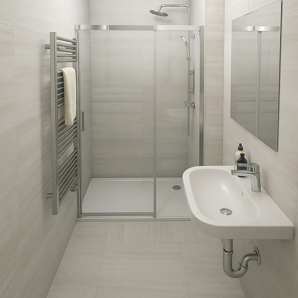 Koupelna je vybavena umyvadlem a prodlouženým sprchovým koutem, toaleta je samostatná.