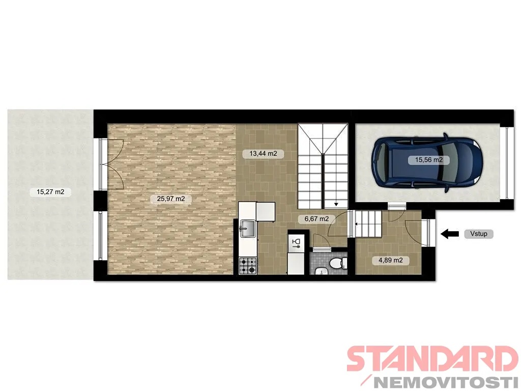 • Garáž: 15,56 m2 (průchod z předsíně) + 1 venkovní stání na zatravňovací dlažbě