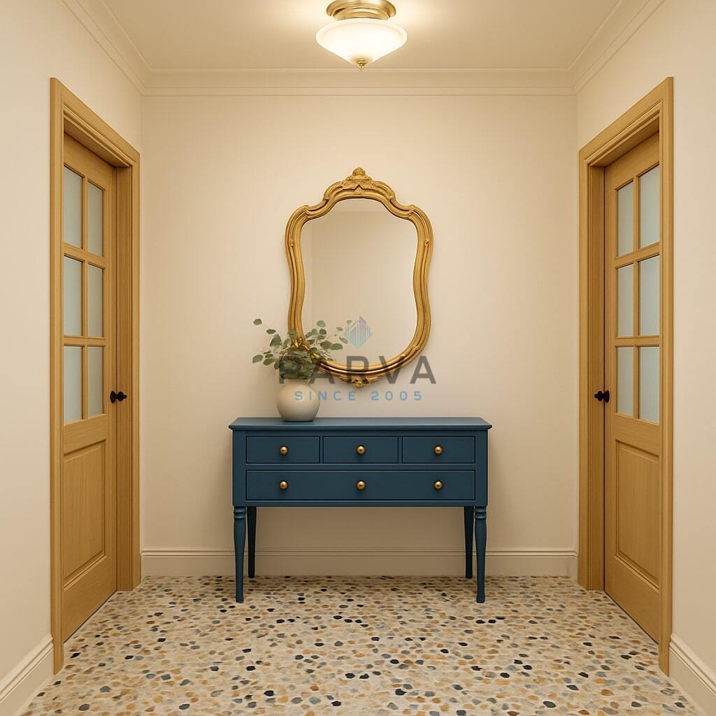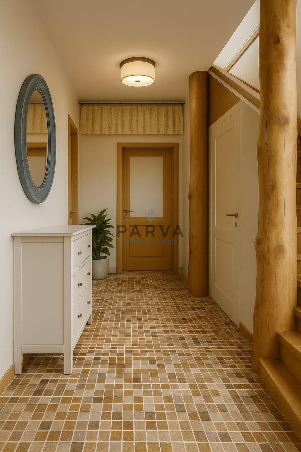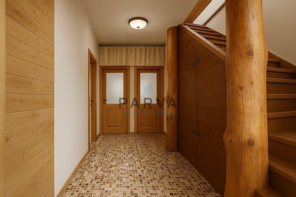 Podlahy - beton, dlažba. Okna - eurookna. V interiéru převládá dřevo - masiv.