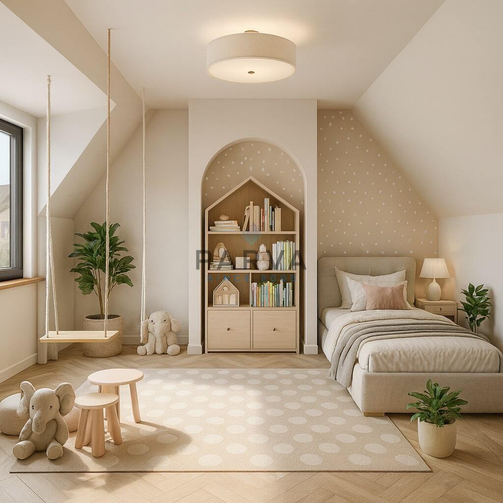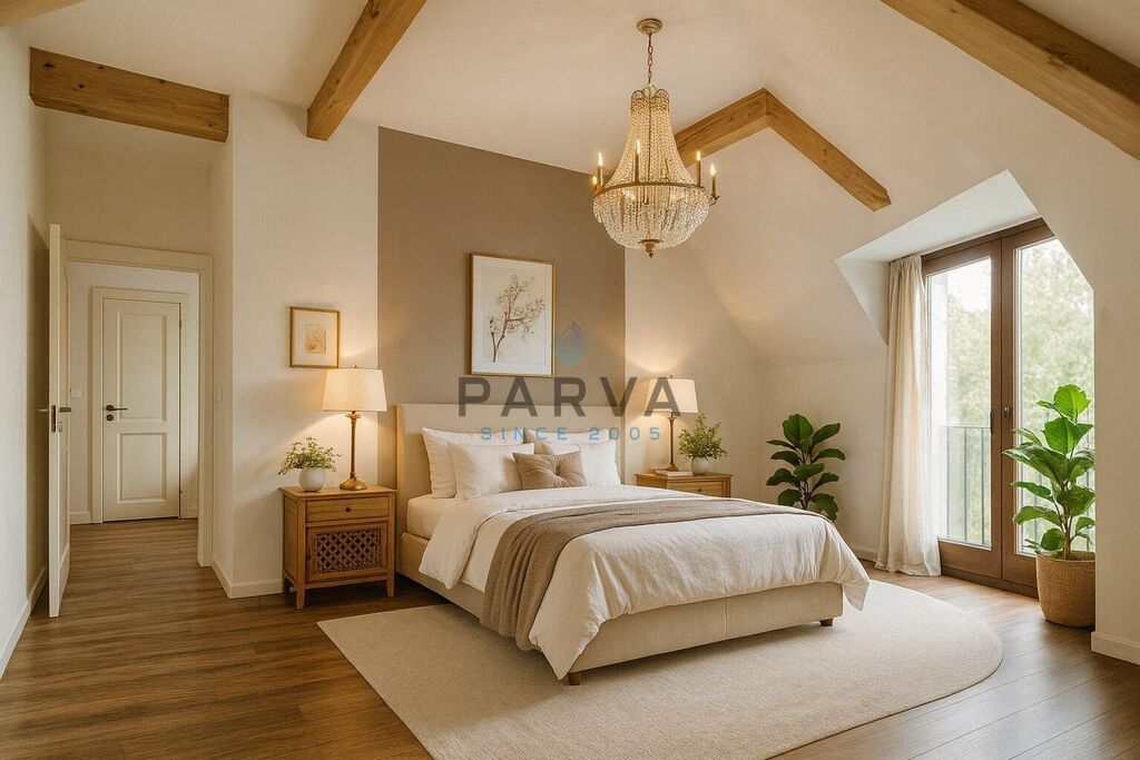 Střecha je sedlová s třemi okny - vikýři, oknem a francouzskými dveřmi.