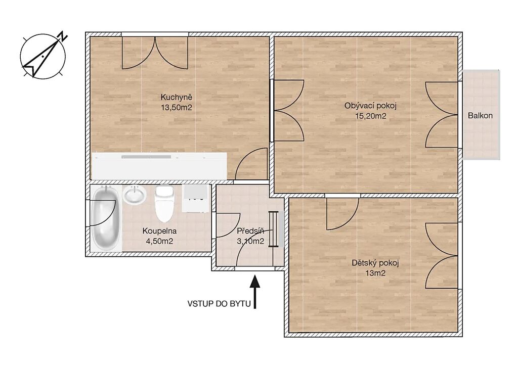Kuchyně tvoří centrální prostor bytu – z ní vede vstup do obývacího pokoje a dále do dětského pokoje. Dispozice je tak přehledná, funkční a přirozeně odděluje jednotlivé části domácnosti.