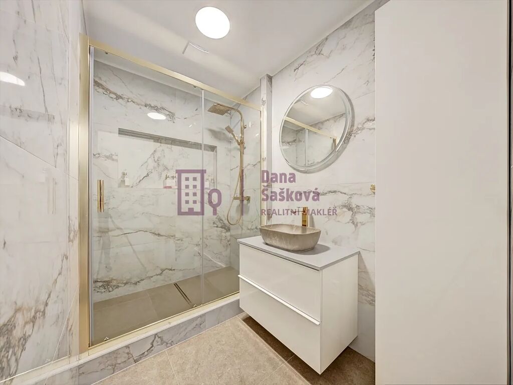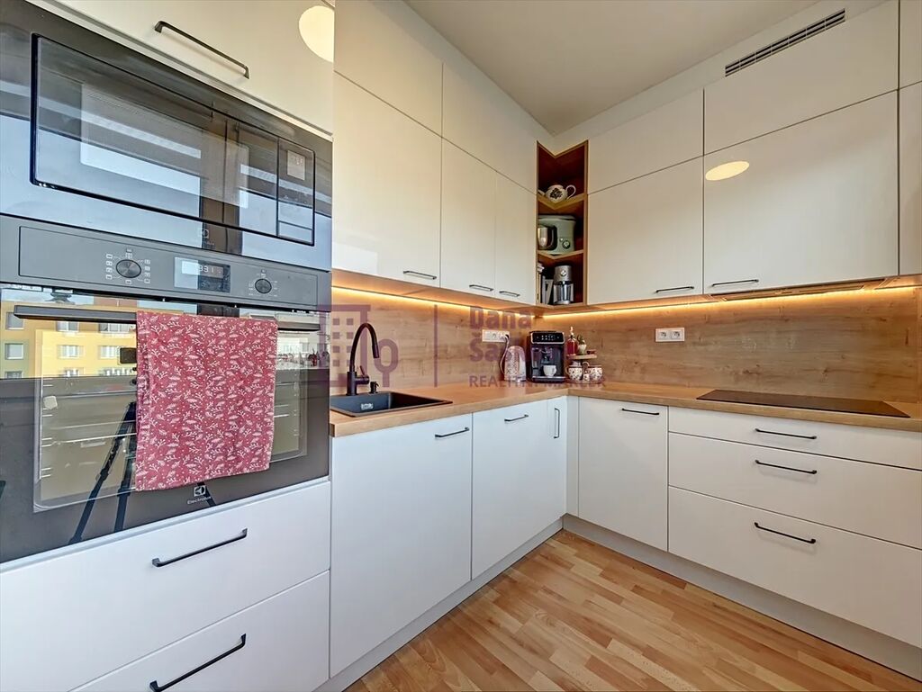 Kuchyňská linka je vybavena dostatečným úložným prostorem a vestavěnou troubou, varnou deskou, mikrovlnnou troubou, digestoří a myčkou. Koupelna nabízí velmi prostorný sprchový kout, na chodbě se nachází vestavěný prostor na pračku, sušičku a skříň.