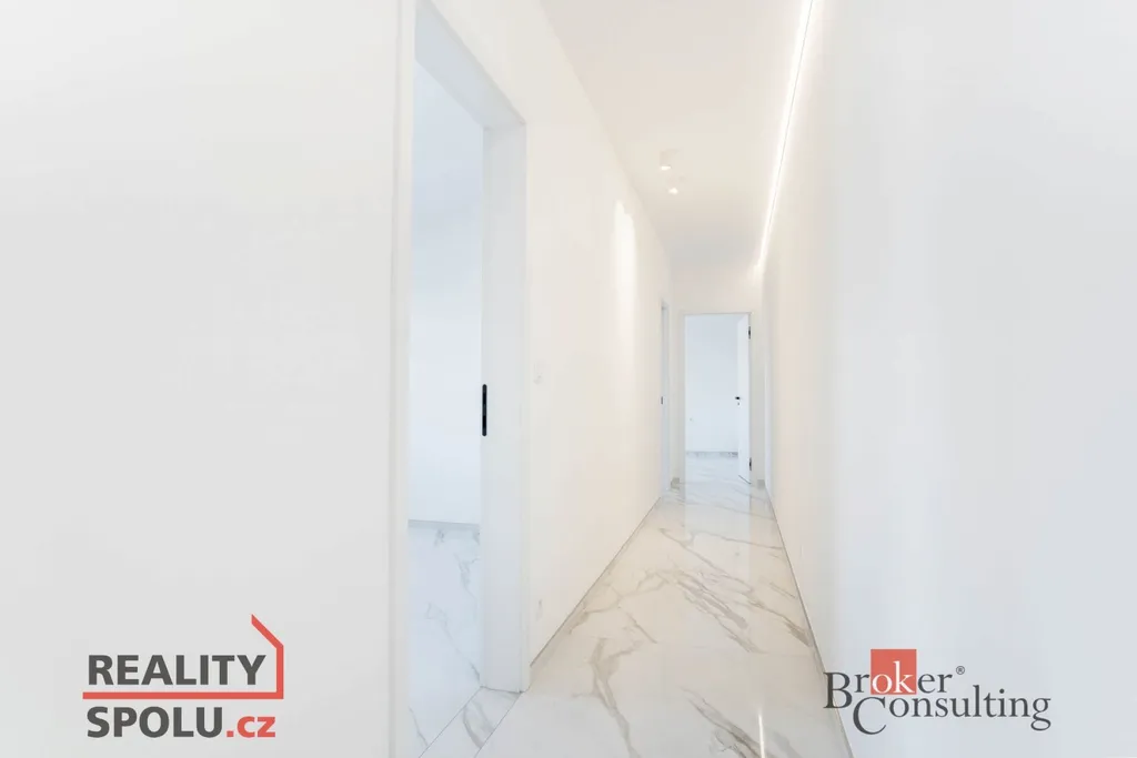 V bytě se nacházejí dvě designové koupelny – jedna vybavená prostornou vanou a toaletou a druhá se sprchovým koutem a taktéž s toaletou. Elegantní chodba s efektním kulatým zrcadlem dotváří luxusní atmosféru celého interiéru a poskytuje dostatek prostoru a úložných možností.