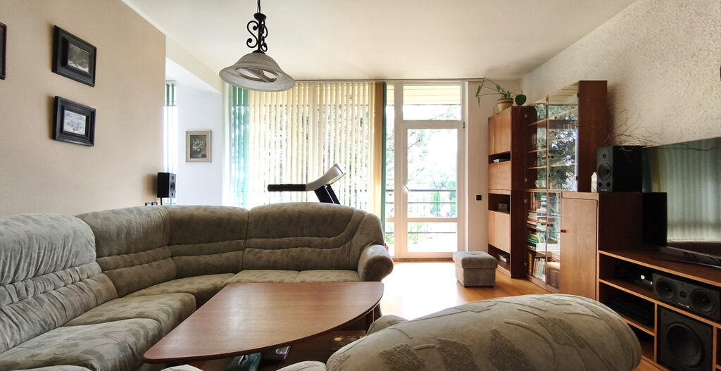 Větší bytová jednotka je přístupná z centrální haly po schodišti do prvního patra /schodiště je odděleno dveřmi/, kde se nachází kuchyně s jídelnou a vstupem na lodžii obývacím pokojem se vstupem na lodžii, ložnicí, koupelnou s vanou, sprchou a toaletou a dvěma pokoji využívanými jako dětské pokojíčky. V domě se nacházejí ještě další skladovací prostory.