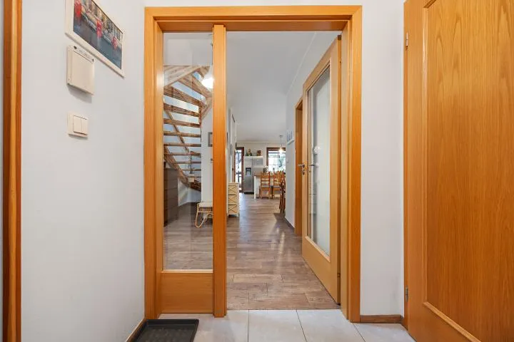 - Dispozice 5+kk, přízemí: vstup, technická místnost, WC pro hosty, vstup do jídelny a kuchyně, která je z části propojená s prostorným obývacím pokojem a vstupem na zastřešenou terasu s venkovním sezením , ložnice (pokoj pro hosty), koupelna, schodiště do patra : chodba, ložnice, dětský pokoj s půdičkou (možnost spaní), pracovna ( dětský pokoj), koupelna s WC.